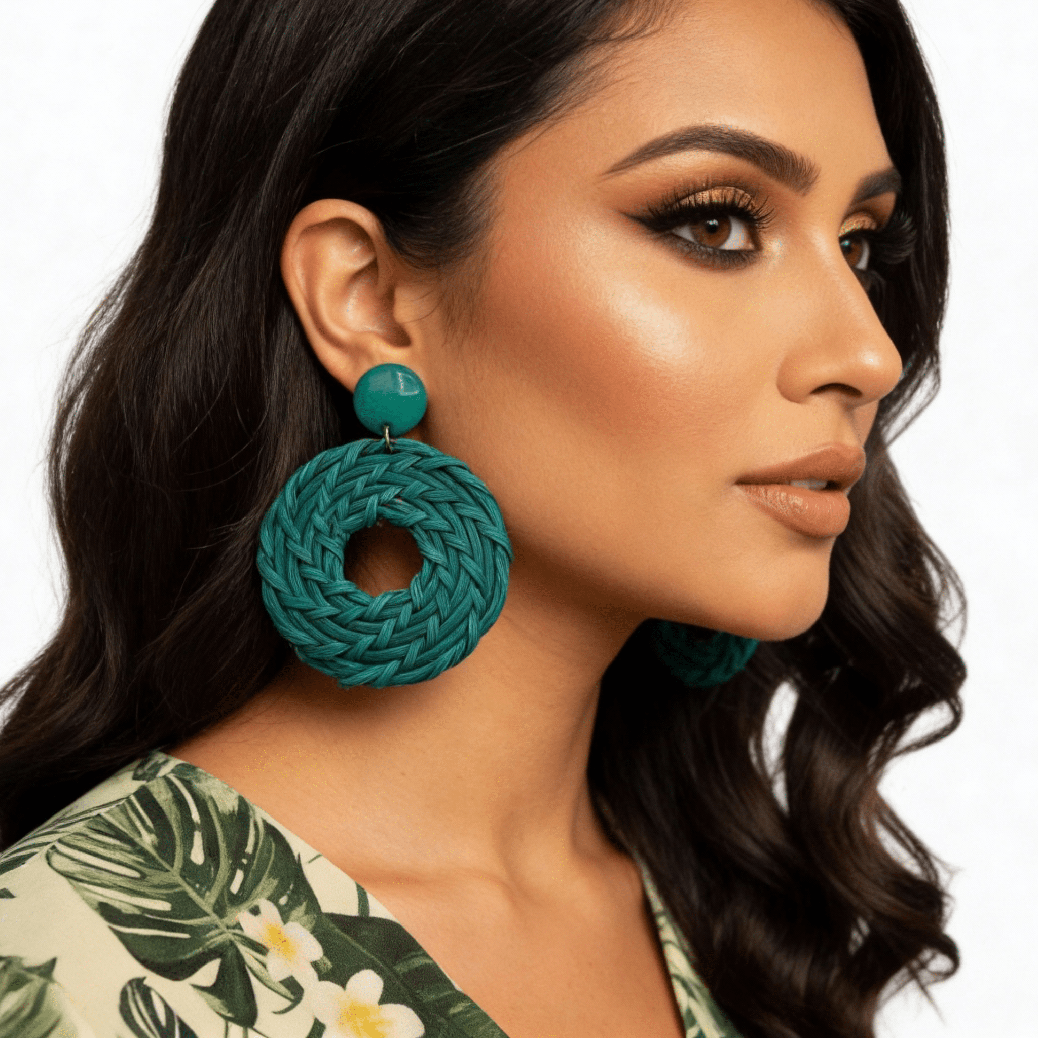old, sculptural, and quietly confident. The Verde Disk Earrings feature a hand-woven circular drop in a rich sea-green tone, designed to bring texture, color, and effortless polish to any look. Lightweight with striking movement, they elevate everything from resort dresses to simple tanks and linen sets.