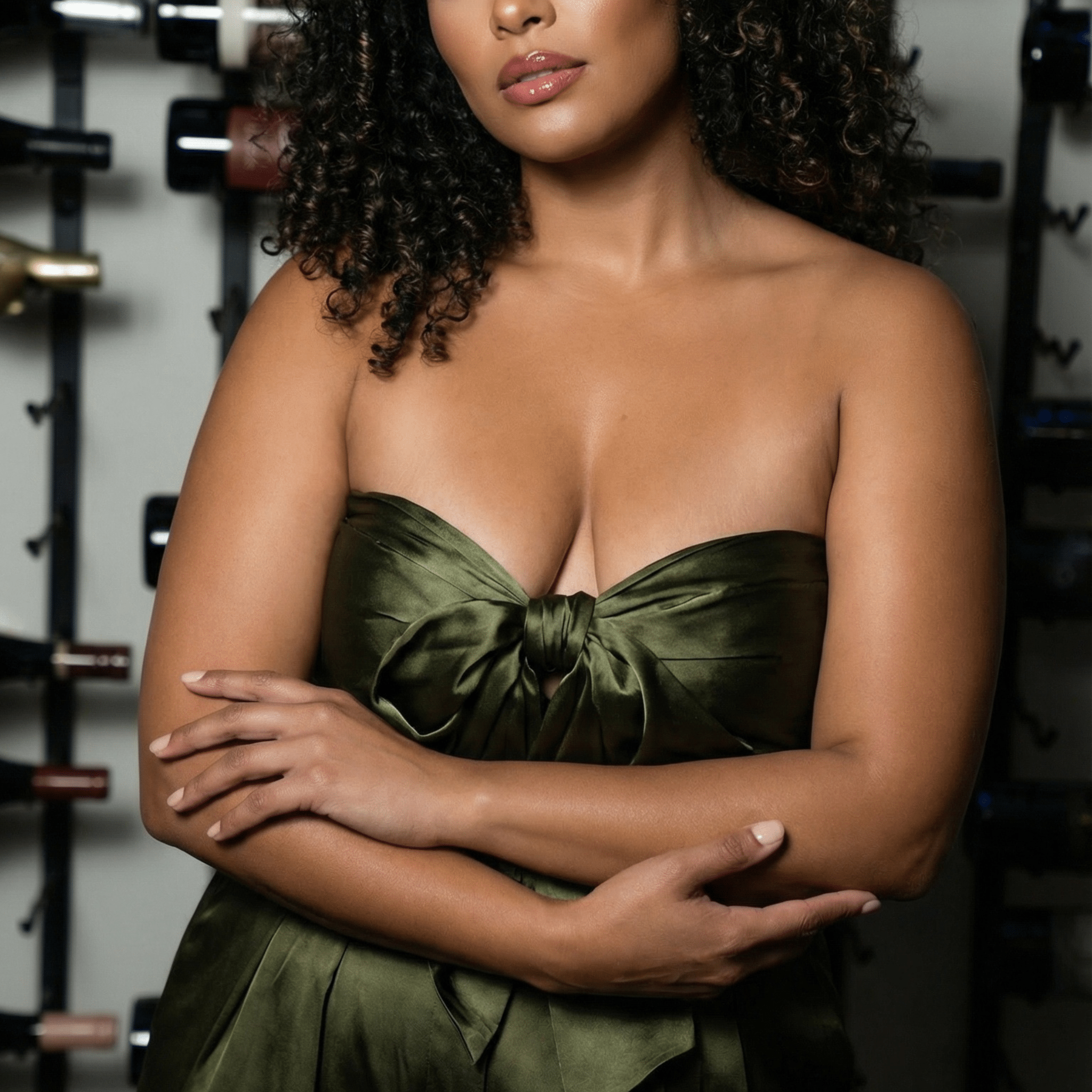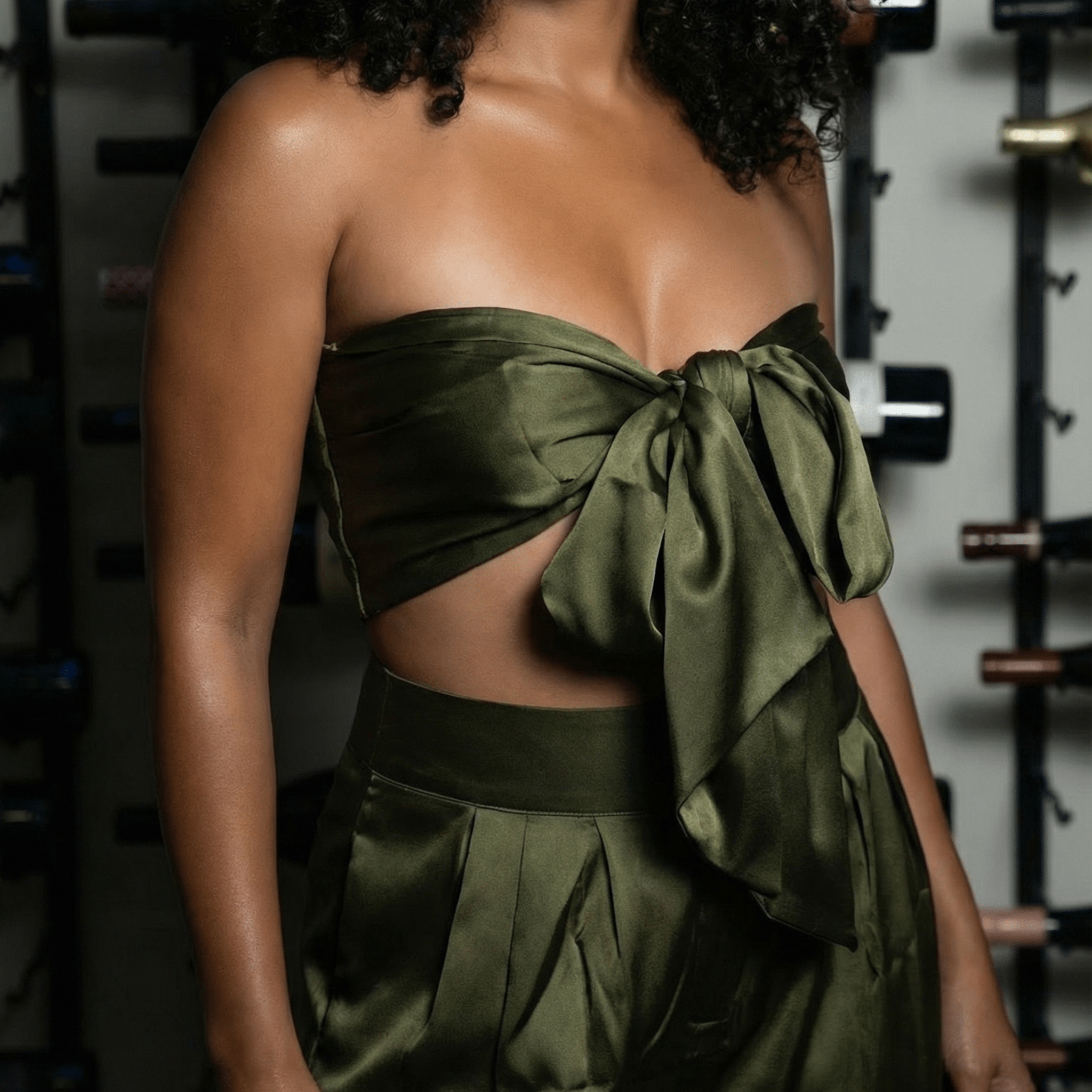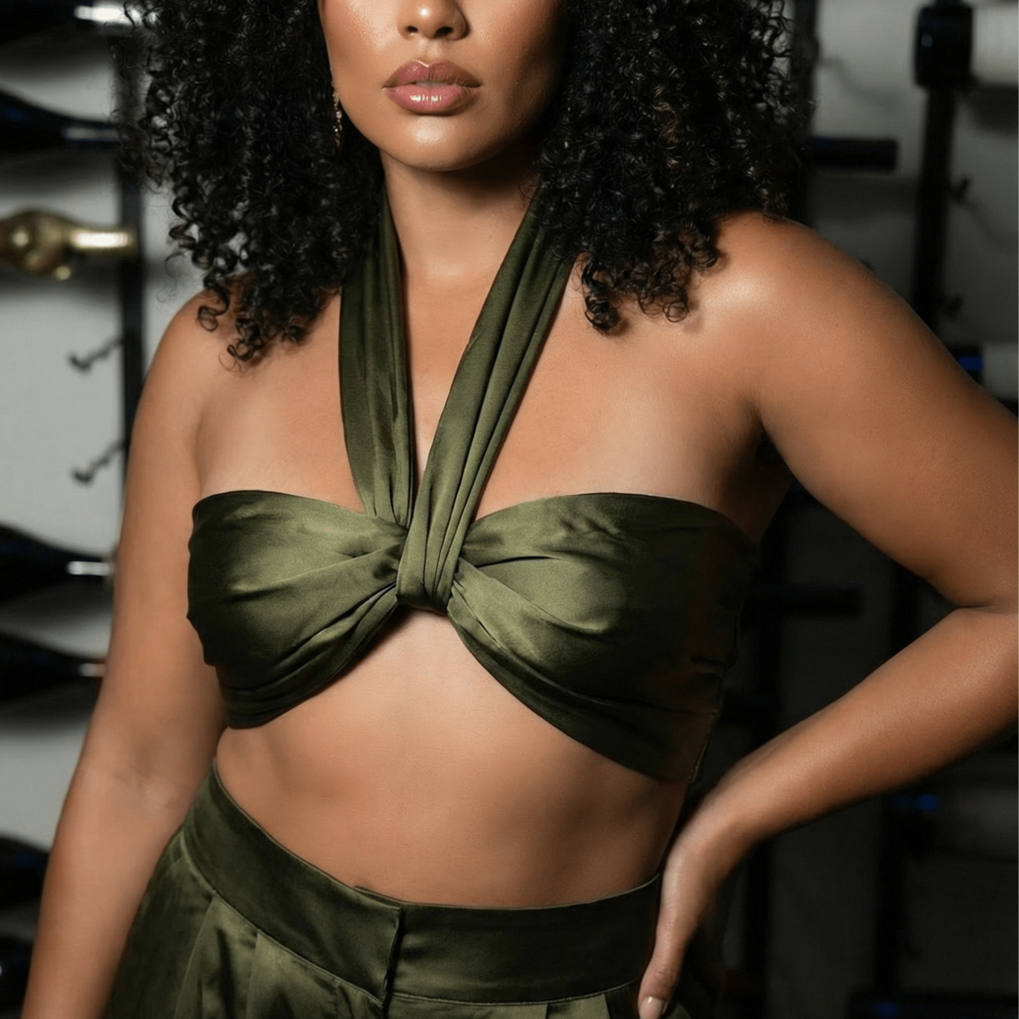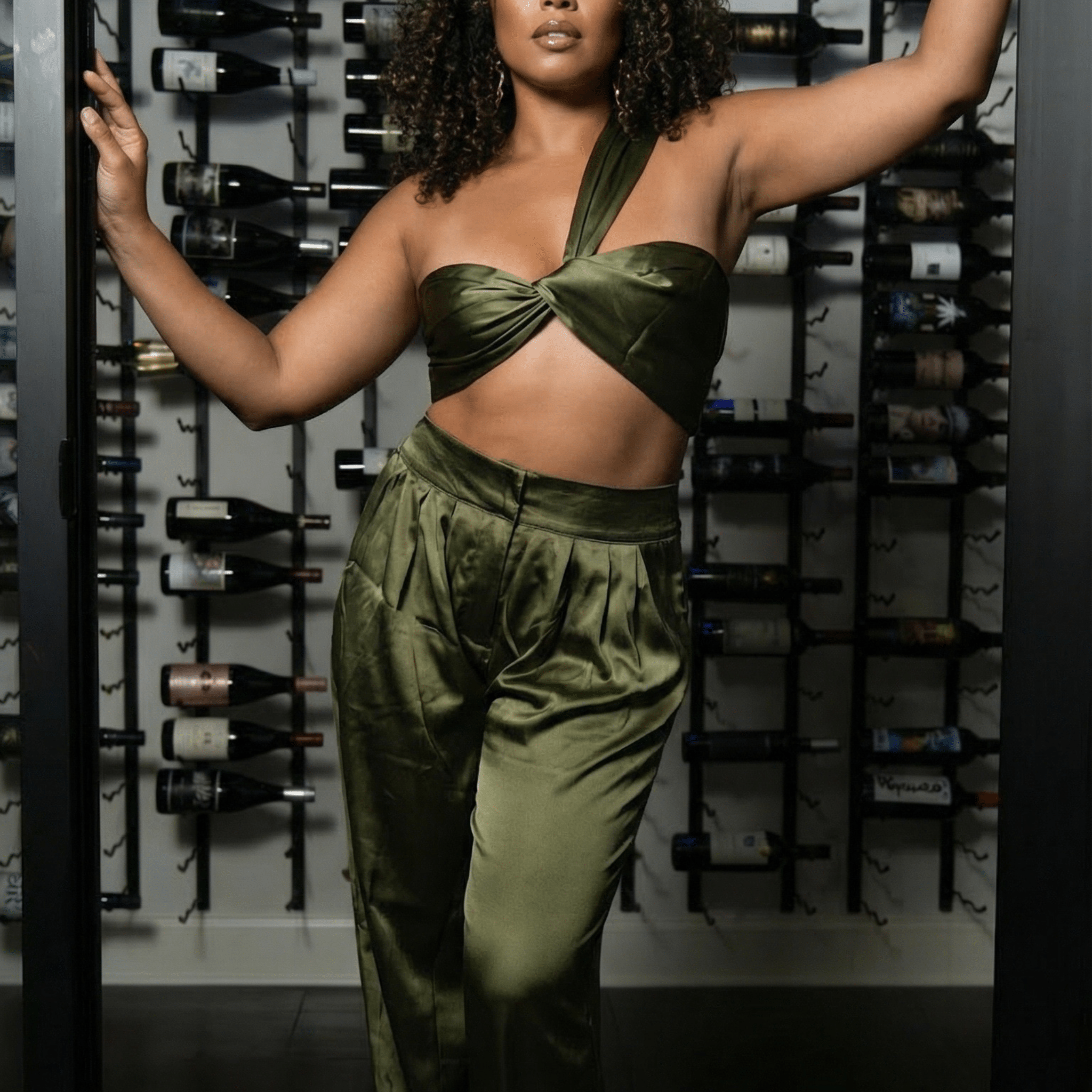Upgrade your wardrobe with the Martini Moves 2-Piece Set – the ultimate statement piece for versatile, modern style. This olive green satin set evokes the classic martini with its luxurious sheen and adaptable design. The innovative tie-front top offers endless styling options (halter, one-shoulder, front twist), while high-waisted trousers flatter your figure.