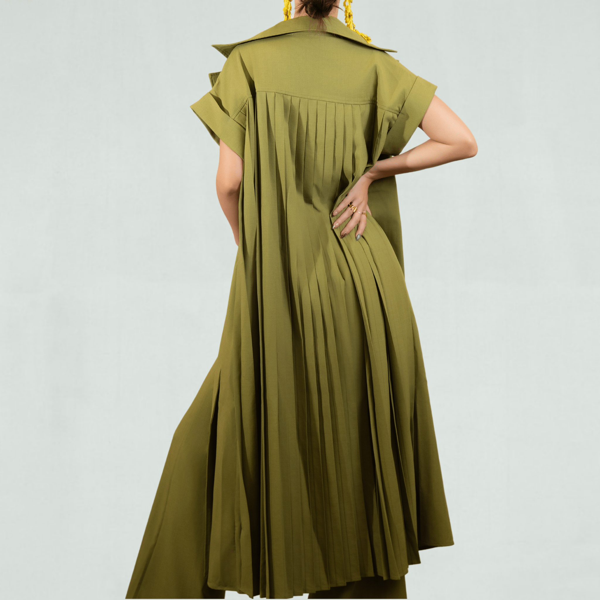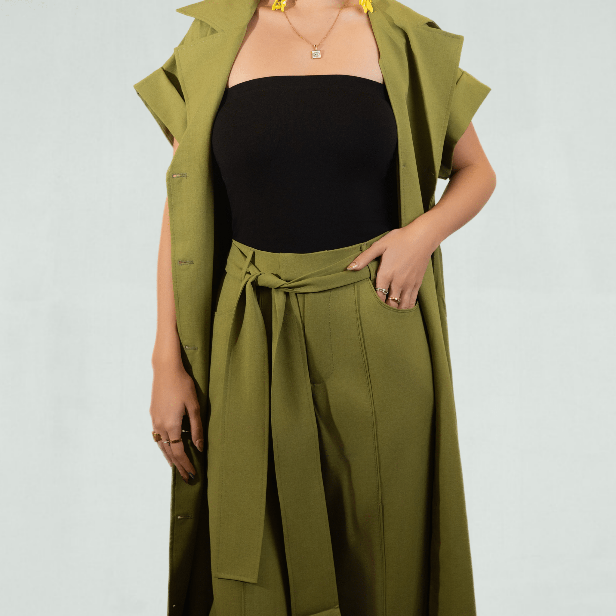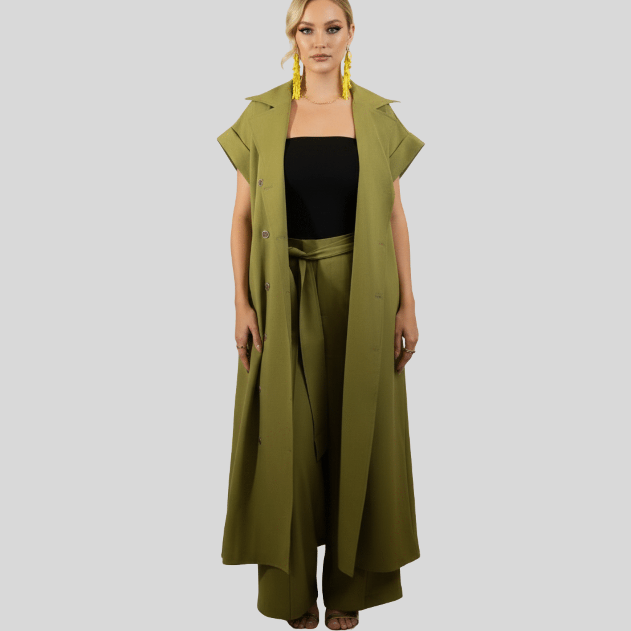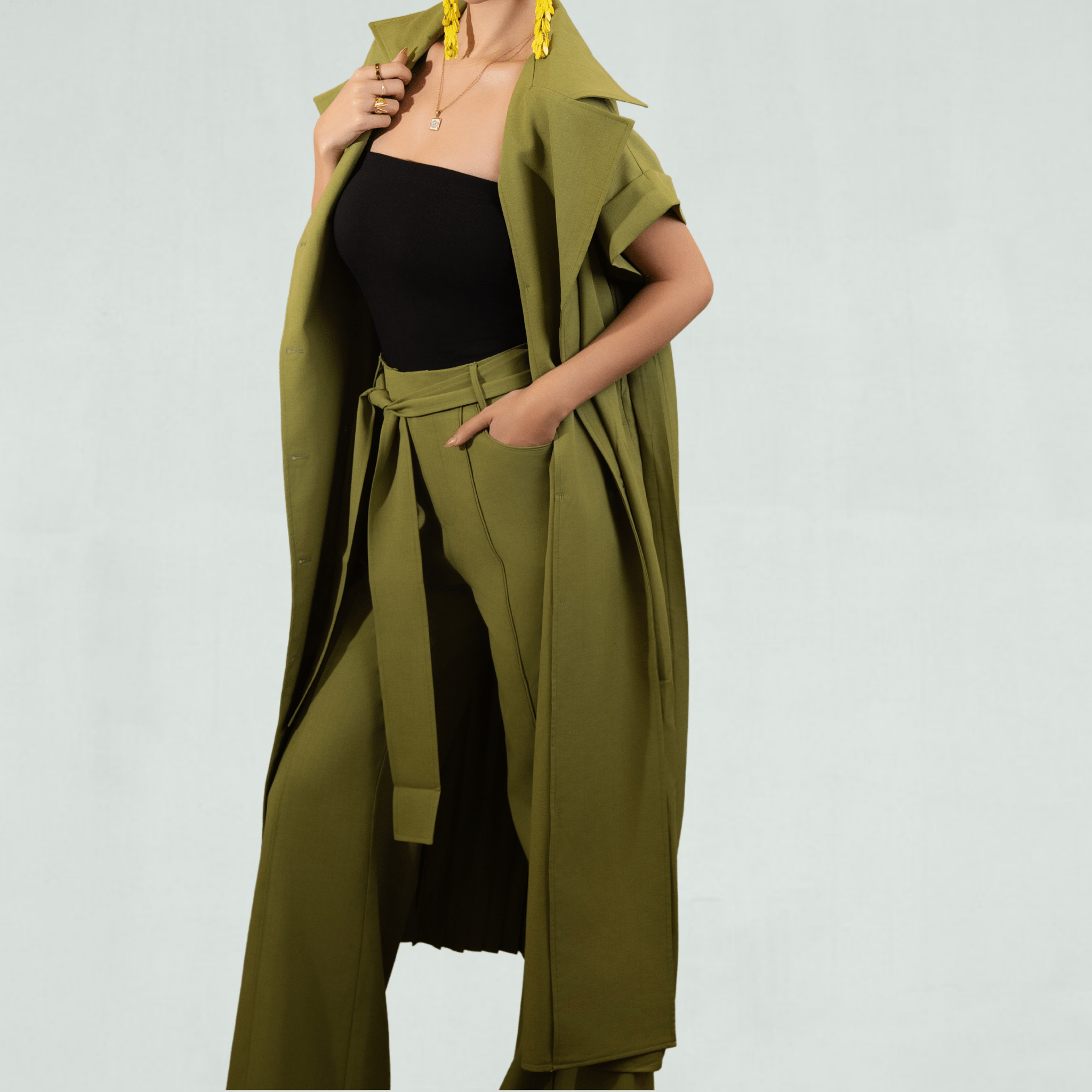 Step into effortless sophistication with the Palm Grove Set, your go-to ensemble for elevated style. Featuring a pleated longline duster jacket and high-waisted wide-leg pants, this chic 2-piece set brings together modern tailoring and resort-inspired elegance. The rich olive green hue makes it the perfect outfit for upscale events, vacation dinners, or statement day-to-night dressing.