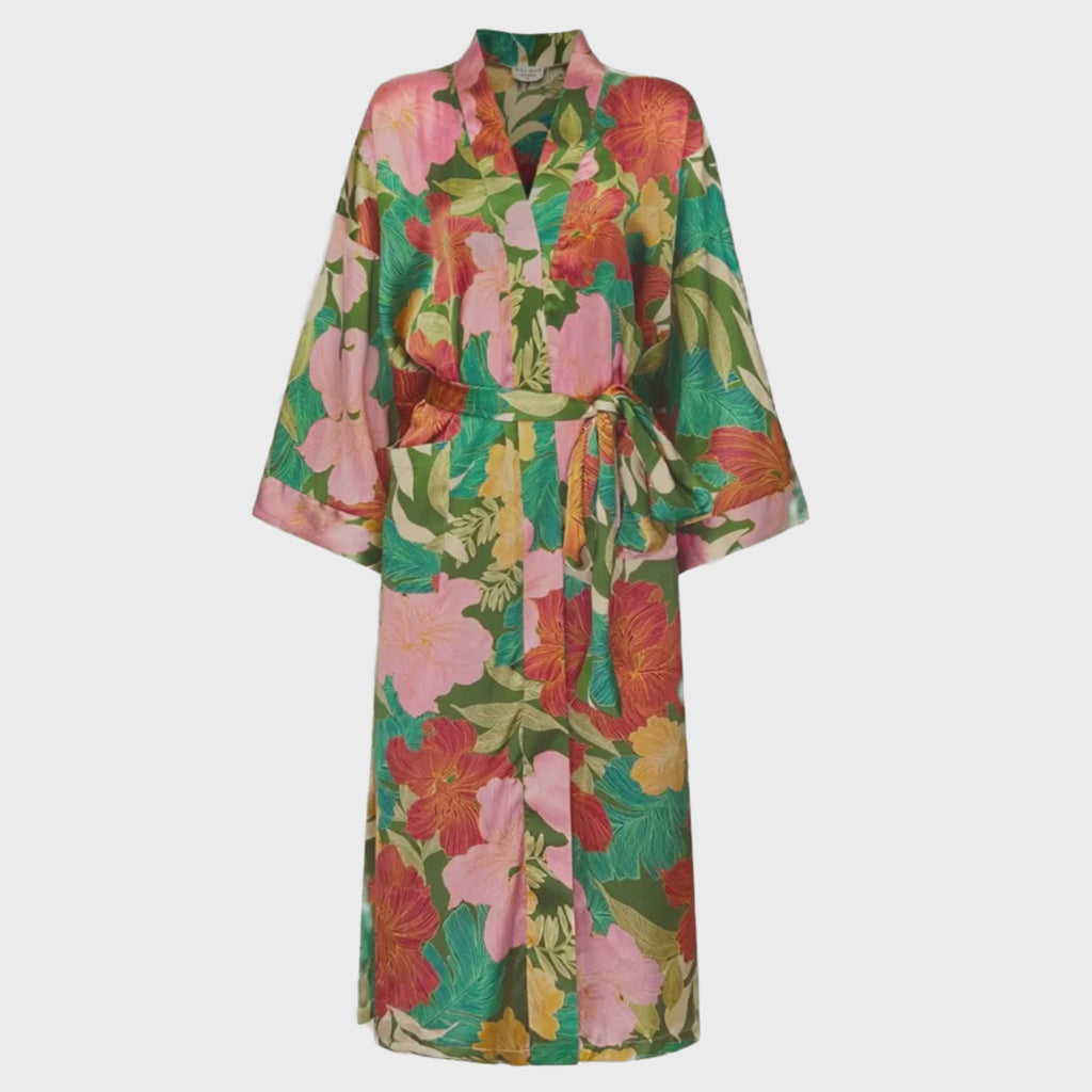 The Los Flores Kimono is your walking tropical daydream. With a lush palette of fuchsia, tangerine, gold, and emerald green florals, this silky statement piece was made to float through summer like a breeze. From beachside cafés to brunch in the city, it’s your perfect layer of color, confidence, and effortless style.