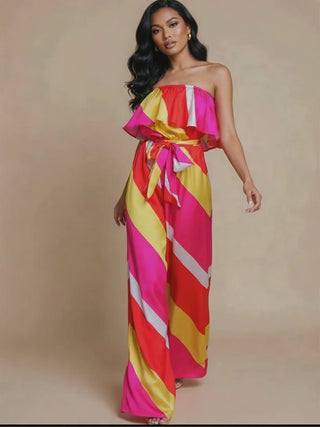 Bold, vibrant, and effortlessly the Simply Splendid Chevron Jumpsuit is your go-to for standout style. Featuring a strapless ruffle bodice, a flattering belted waist, and wide-leg silhouette, this jumpsuit is designed for statement-making moments.