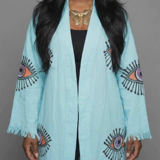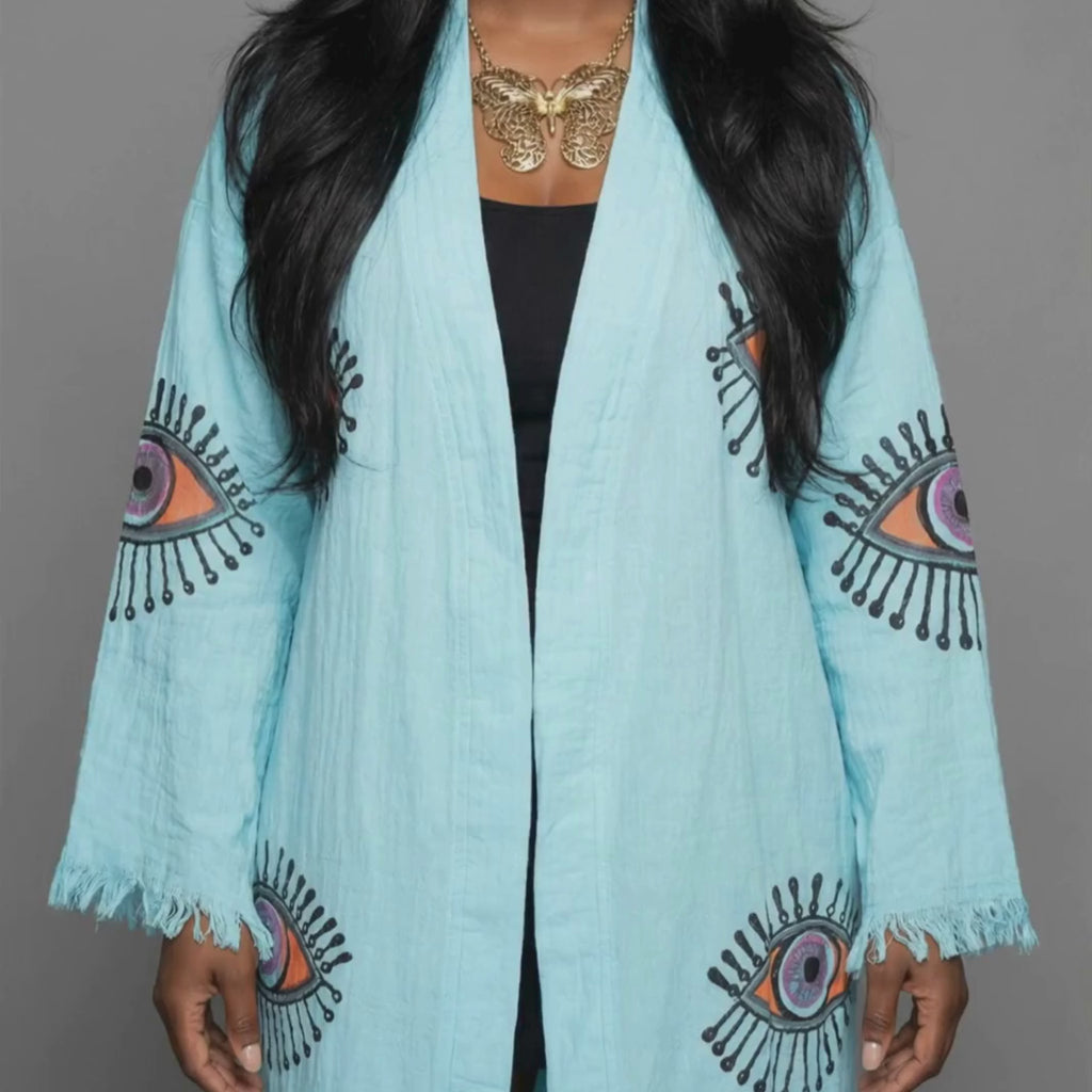 Crafted from 100% Turkish cotton, The Eyes Have It Kimono is a wearable work of art — blending comfort, craftsmanship, and symbolism. Each embroidered eye is a reminder to stay present, protected, and radiant in your own light.