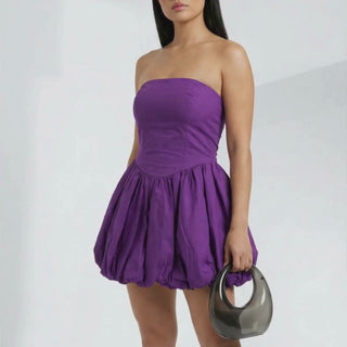 Introducing the Pomp and Circumstance Purple Mini Dress — a show-stopping piece that brings both drama and sophistication to any event. With its structured bodice and voluminous bubble skirt, this mini dress exudes confidence and flair. The strapless design offers a sleek silhouette, while the rich purple hue adds a pop of regal color to your wardrobe. Perfect for making a bold statement at your next special occasion.