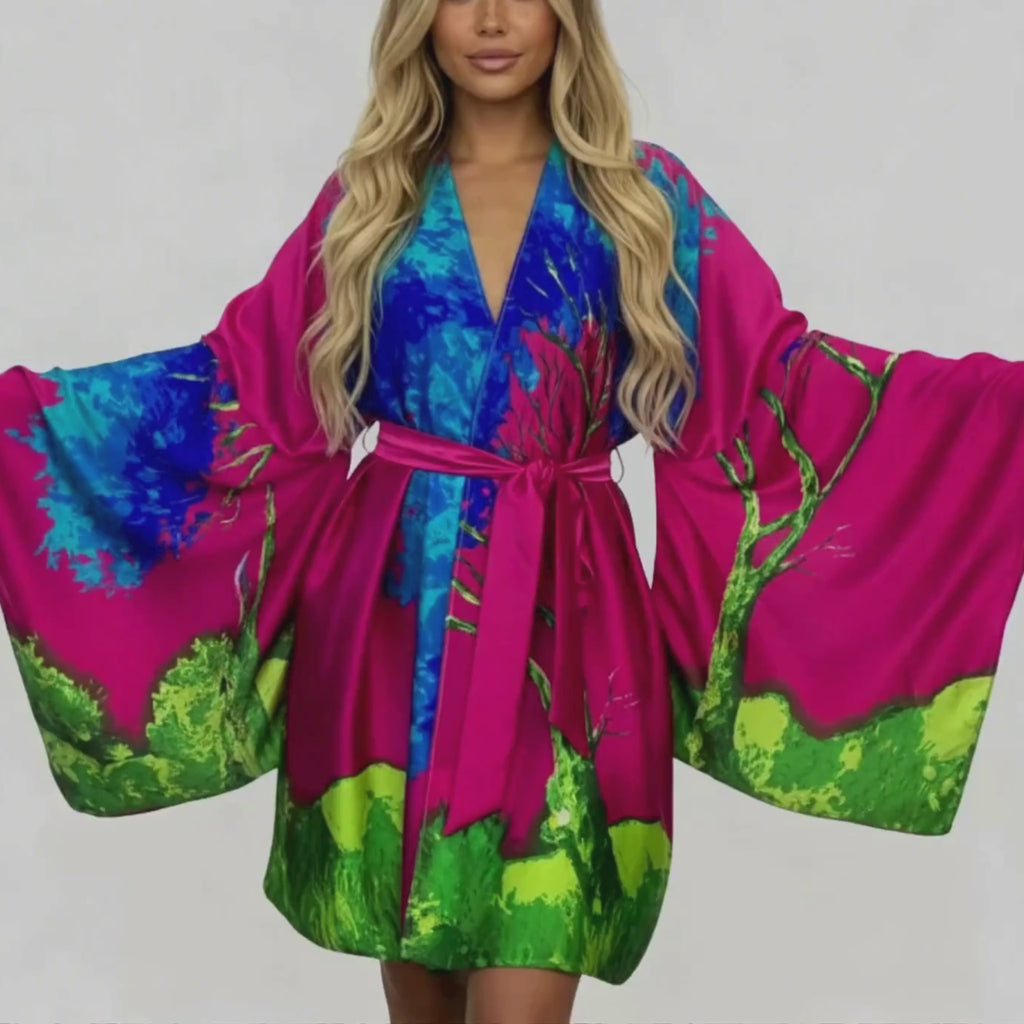 Featuring dramatic dropped kimono sleeves and a vibrant abstract landscape print, the Portofino Kimono moves beautifully with every step. Its oversized, flowy silhouette fits sizes 2–22, making it a stunning, inclusive statement piece for all body types.