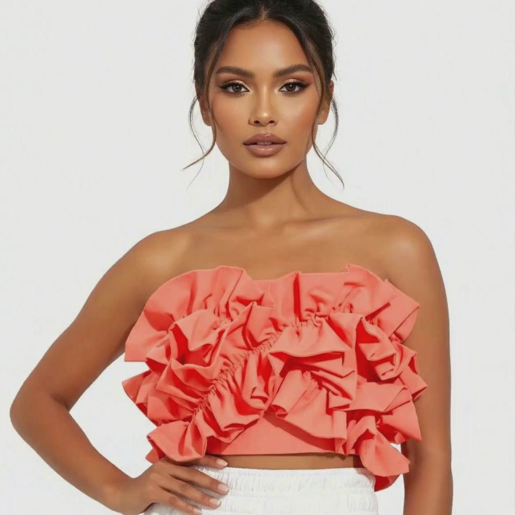 Turn every moment into a statement with the Castarra Top, a bold coral ruffle crop top designed for the woman who loves to stand out. This off-shoulder blouse features layered ruffles, a flattering cropped fit, and an elasticized hem that blends comfort with runway-inspired style.