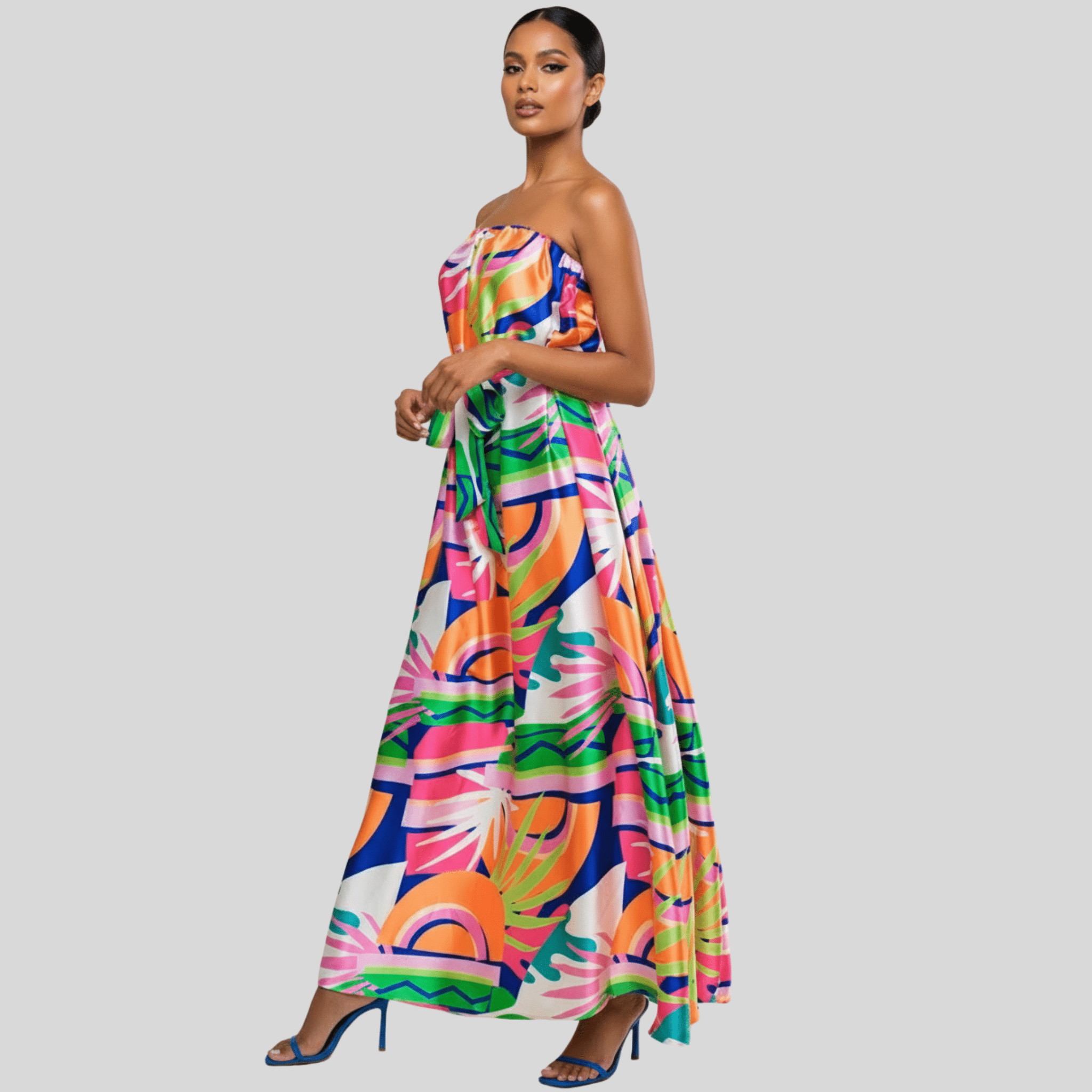 Step into a burst of tropical color with the Sunset Mosaic Maxi Dress. Featuring bold, vibrant prints inspired by palm leaves and glowing sunsets, this strapless maxi dress is perfect for vacations, beach days, or summer soirées. The lightweight fabric and flowy silhouette provide all-day comfort, while the adjustable waist tie enhances your figure. Effortlessly chic, this dress pairs beautifully with sandals for a casual daytime look or heels and bold earrings for an evening out.