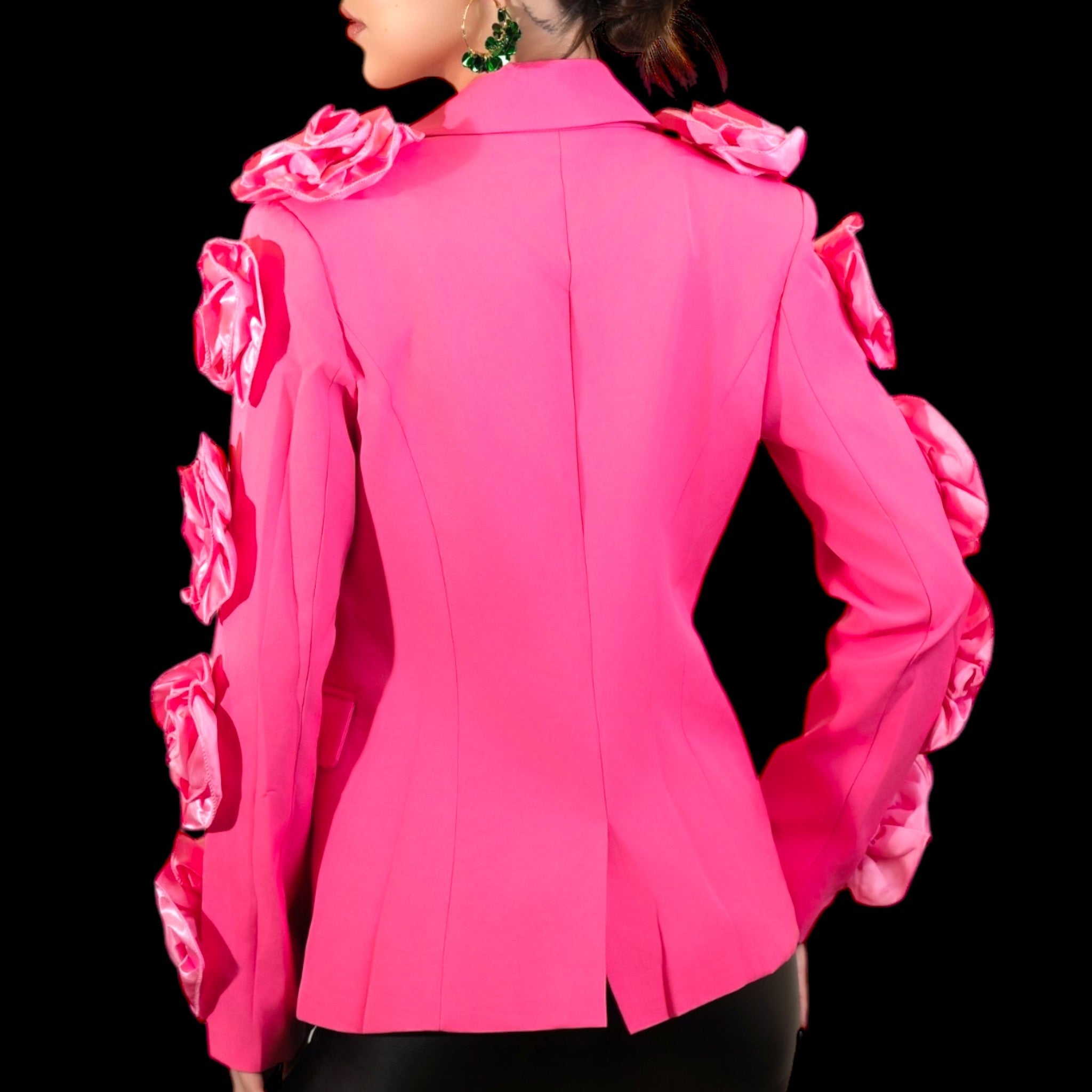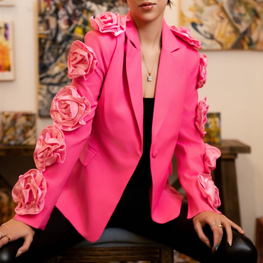 Crafted in a vibrant, electric pink hue, this tailored blazer features hand-crafted 3D rosette detailing cascading down each sleeve and along the shoulder line. The structured fit creates a sharp silhouette while the soft floral appliqués bring a luxe, couture-inspired touch.