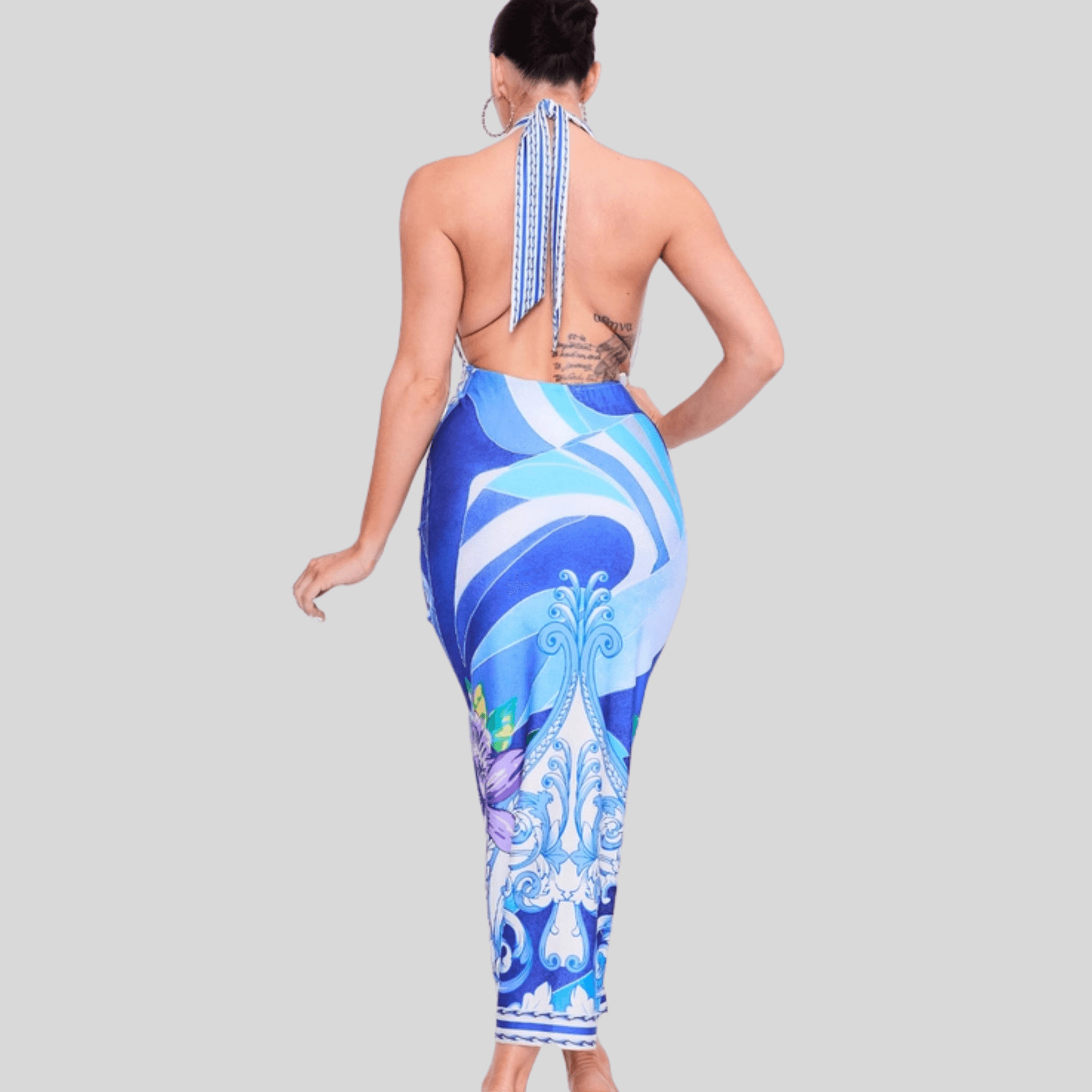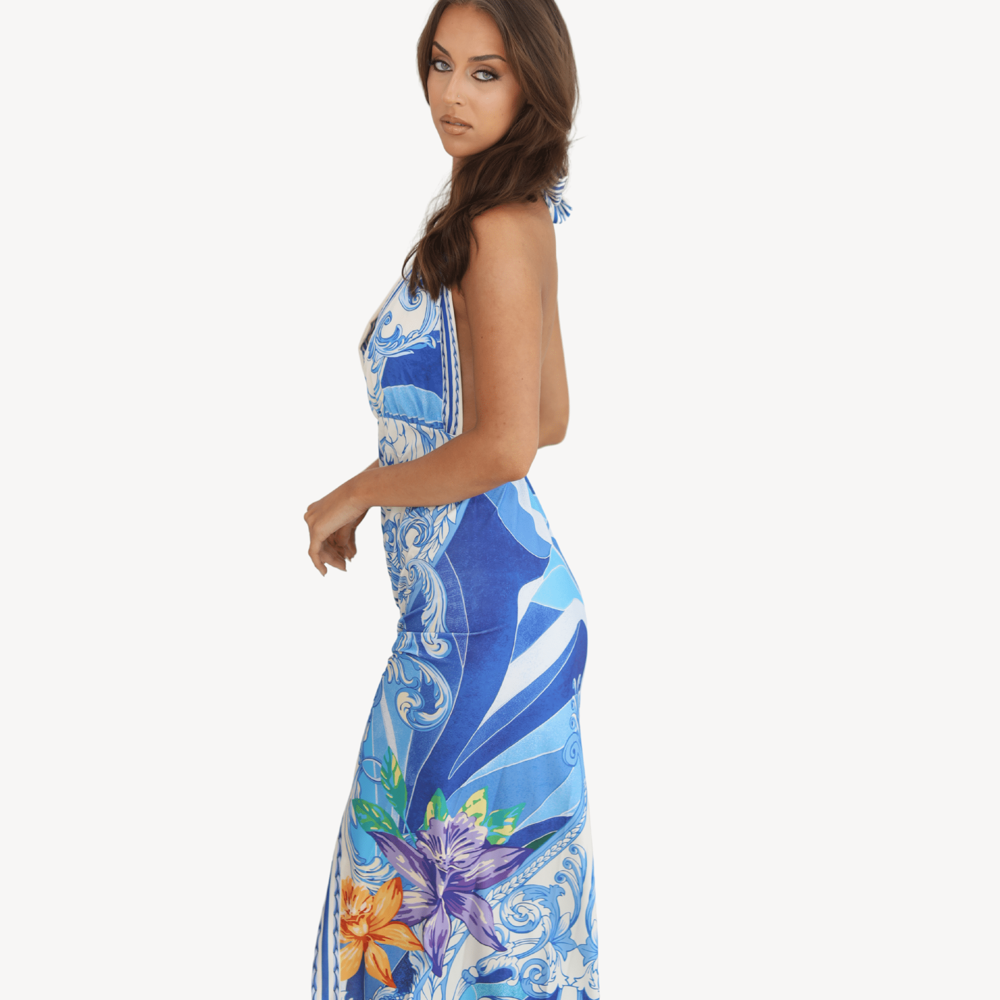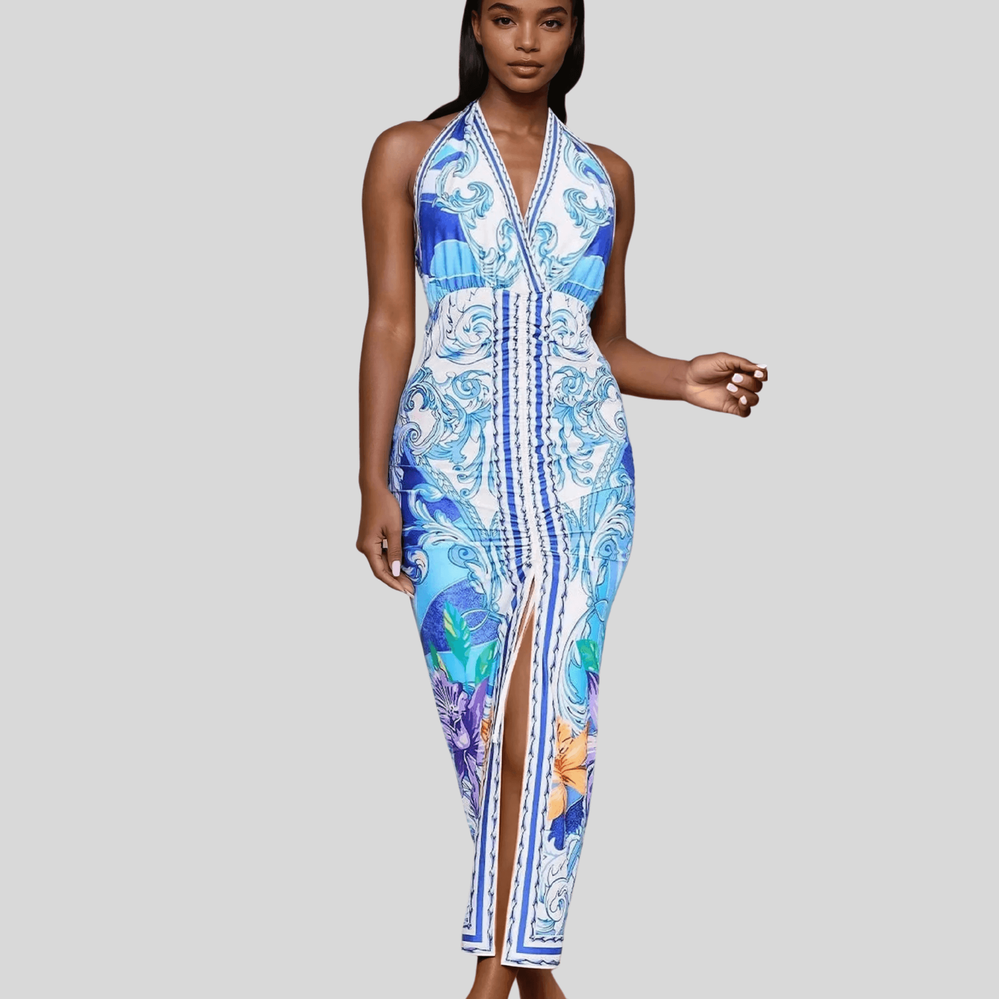The baroque-inspired blue and violet print evokes the beauty of Mediterranean tilework, while the body-sculpting silhouette keeps the vibe effortlessly luxe. Whether you're packing for Positano or styling for a special event, this piece brings runway energy to real life.