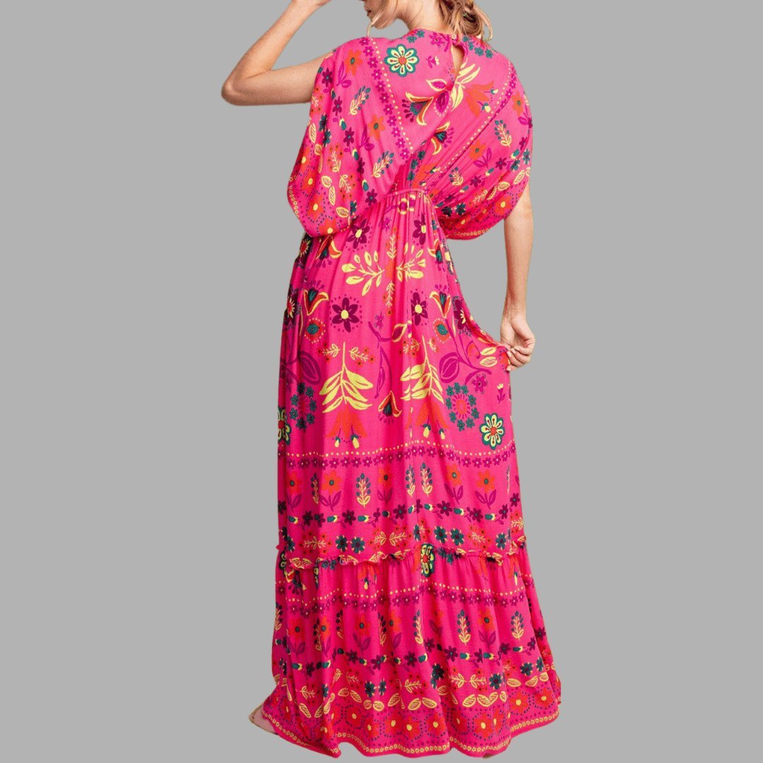 Flourishing Style The dress features a rich tapestry of florals that dance across a vivid pink gauze fabric. Each flower is a burst of color that mirrors the vibrant landscapes of your favorite sunny retreats.
