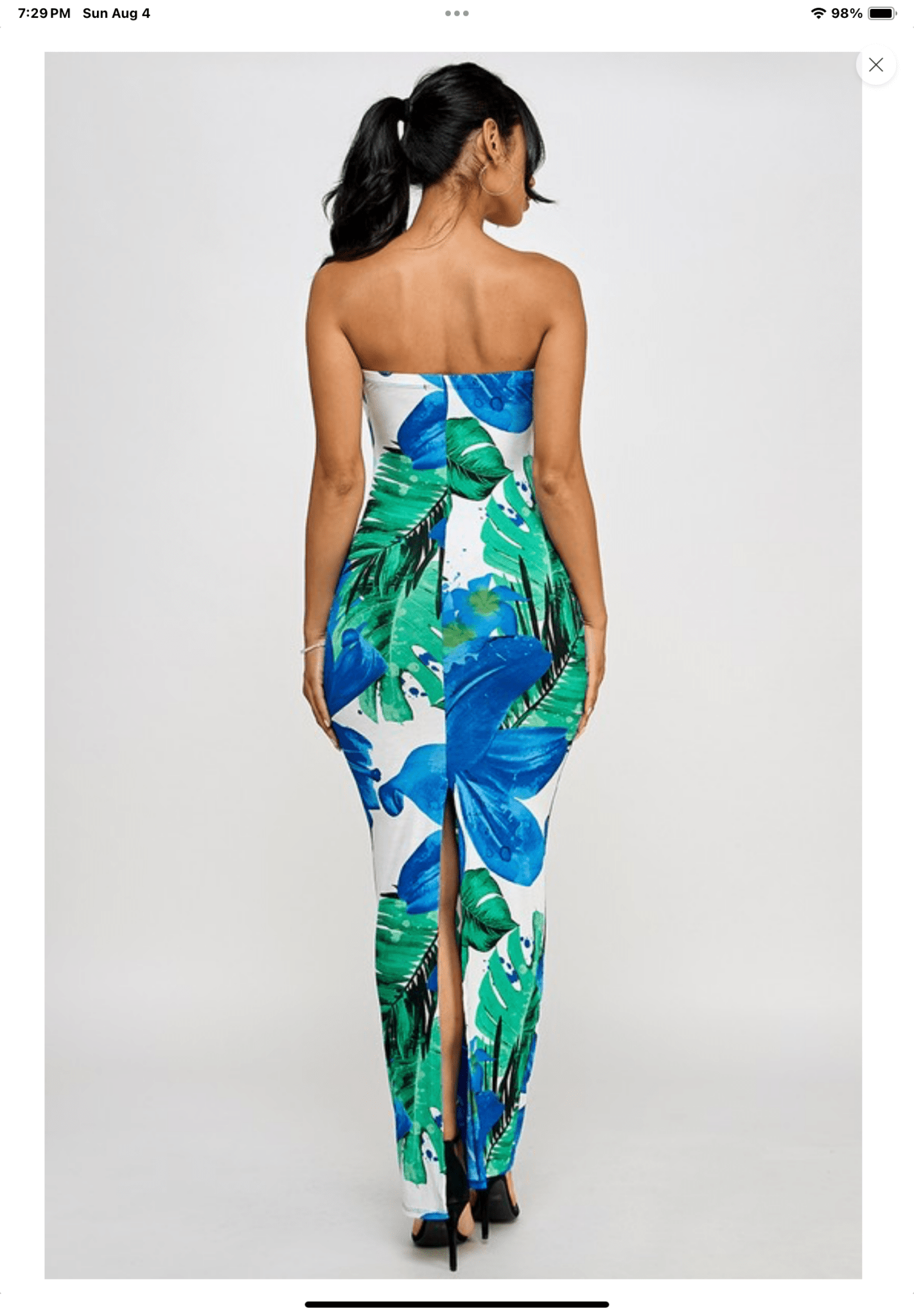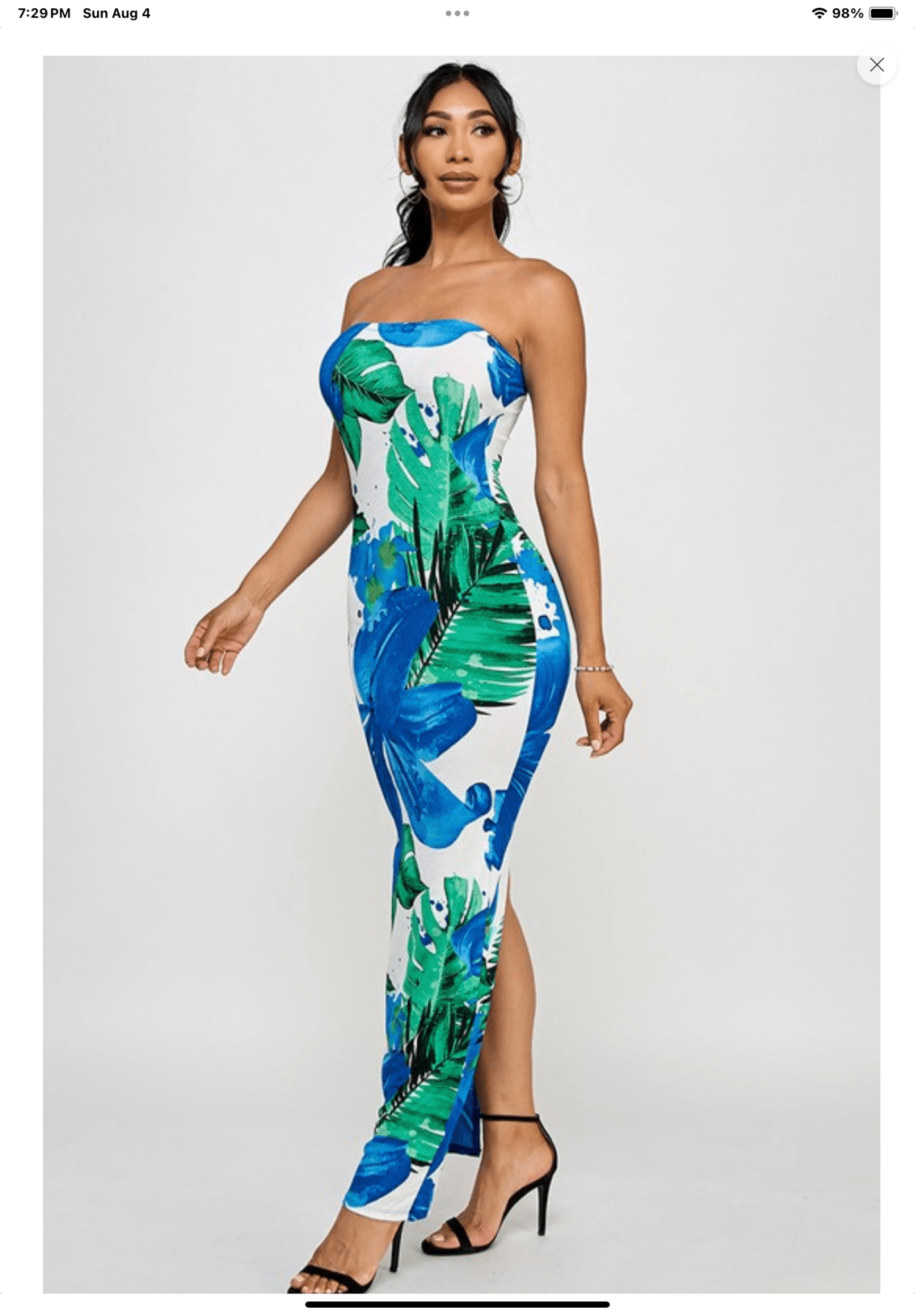 Embrace the essence of a tropical getaway with our Escape to Paradise Maxi Dress. This vibrant strapless dress features a bold floral print, hugging your curves with a flattering silhouette. The split adds a touch of allure, while the lightweight fabric ensures all-day comfort.