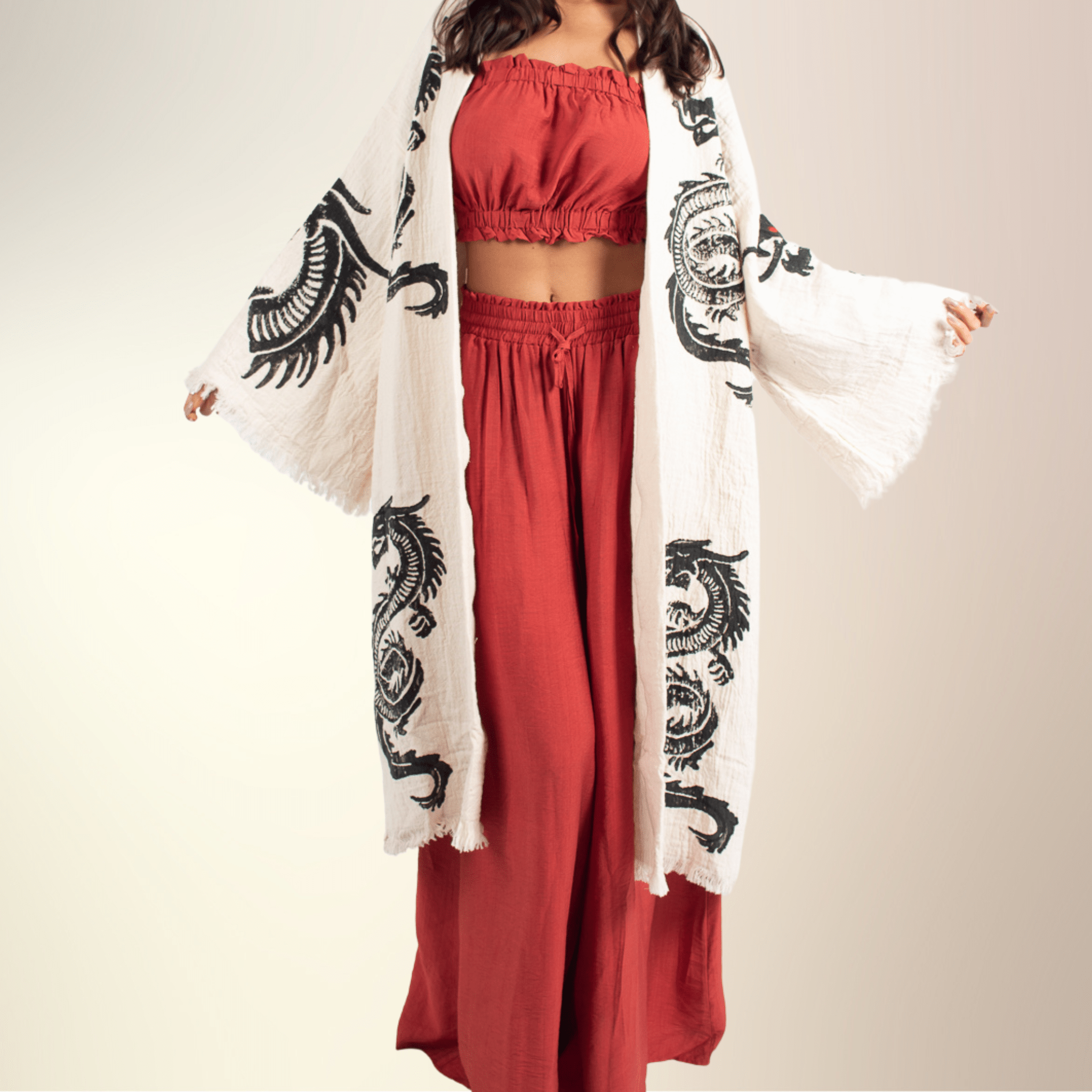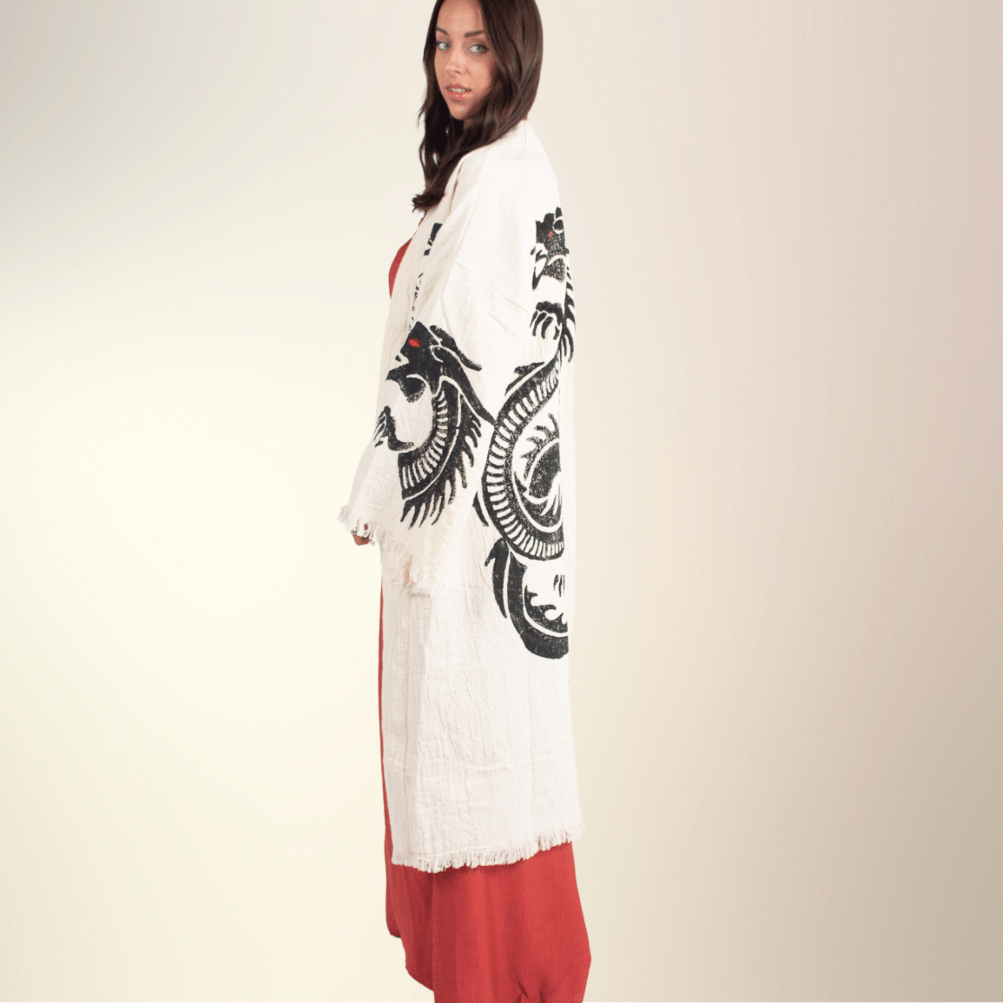 Indulge in luxurious comfort with the Red Dragon Kimono, handcrafted from 100% organic cotton. This boho-inspired kimono features a striking dragon design, offering a whimsical touch to your loungewear or casual outfits. Whether you’re relaxing at home or styling it with jeans for an effortlessly chic look, this eco-friendly kimono provides unmatched softness and sustainability. A versatile wardrobe addition that merges comfort, style, and environmental consciousness.