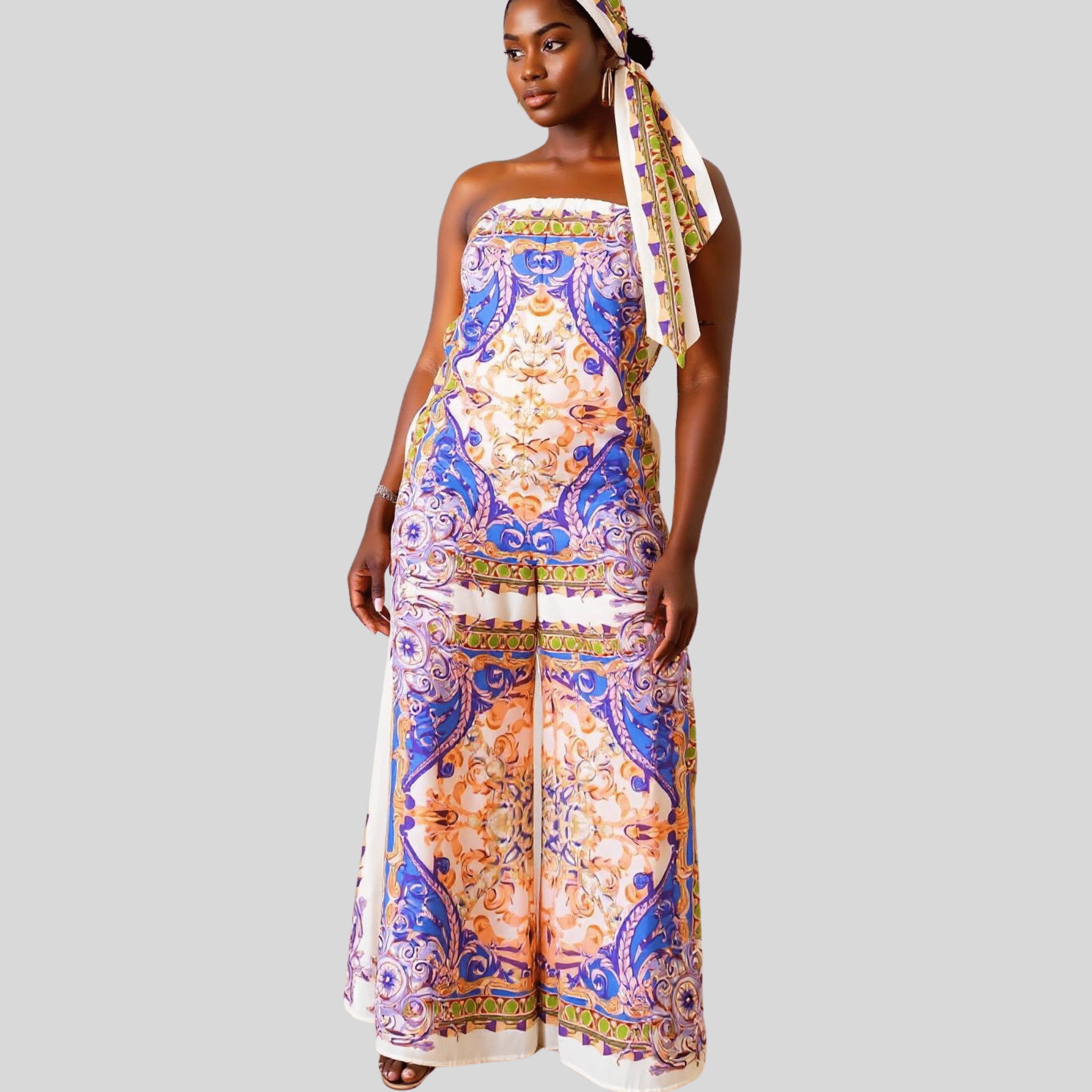 Vibrant, bold, and effortlessly luxe—the Sunny Day in Capri Jumpsuit brings the romance of the Mediterranean straight to your wardrobe. With its scarf-inspired baroque print and wide-leg silhouette, this strapless jumpsuit is made for golden hour strolls and rooftop toasts.