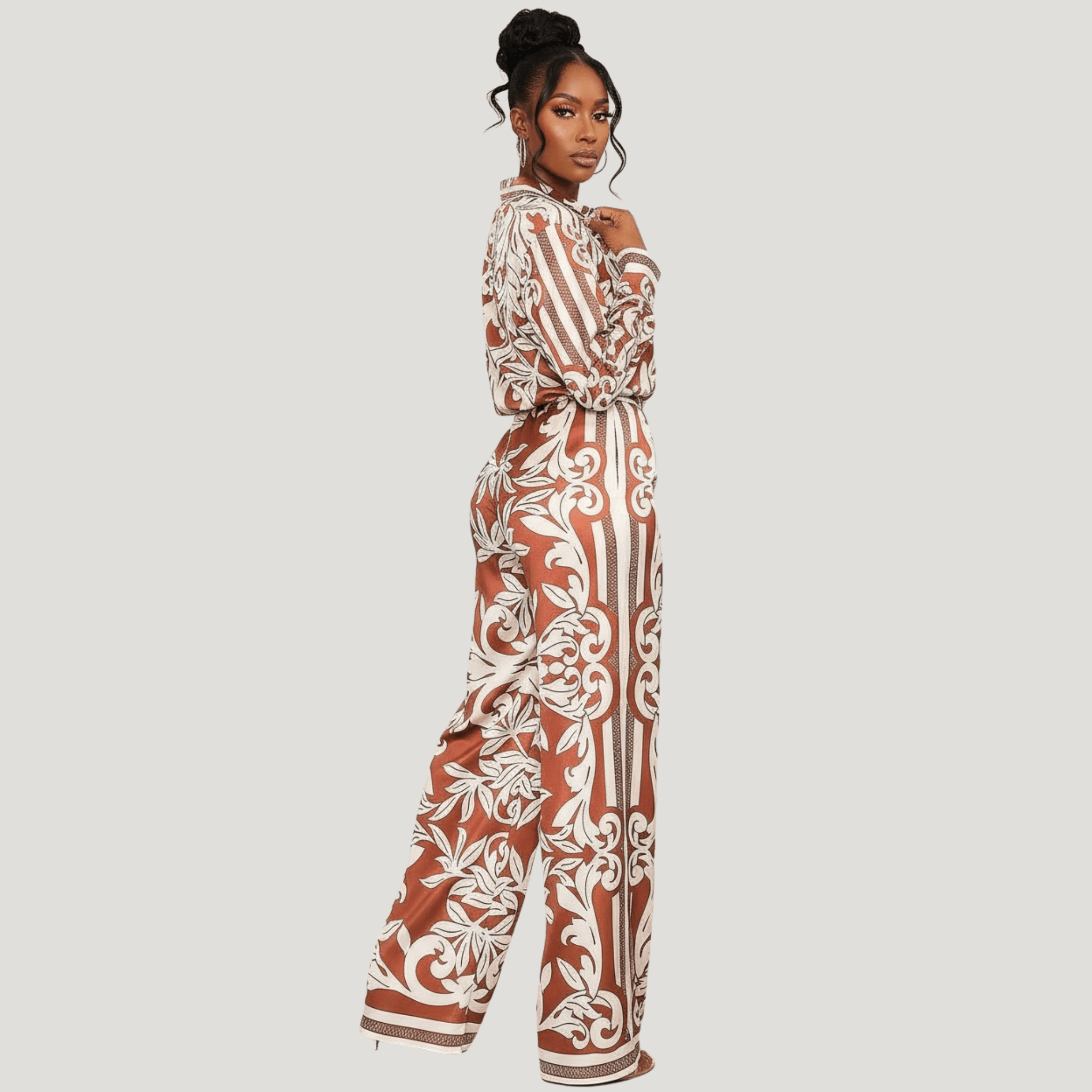 Step into effortless sophistication with the Fall in The City Set — a satin-feel statement look designed for modern glamour and metropolitan ease. The rich bronze and ivory baroque print catches the light with every move, while the silky fabric drapes beautifully for that just-off-the-runway finish.