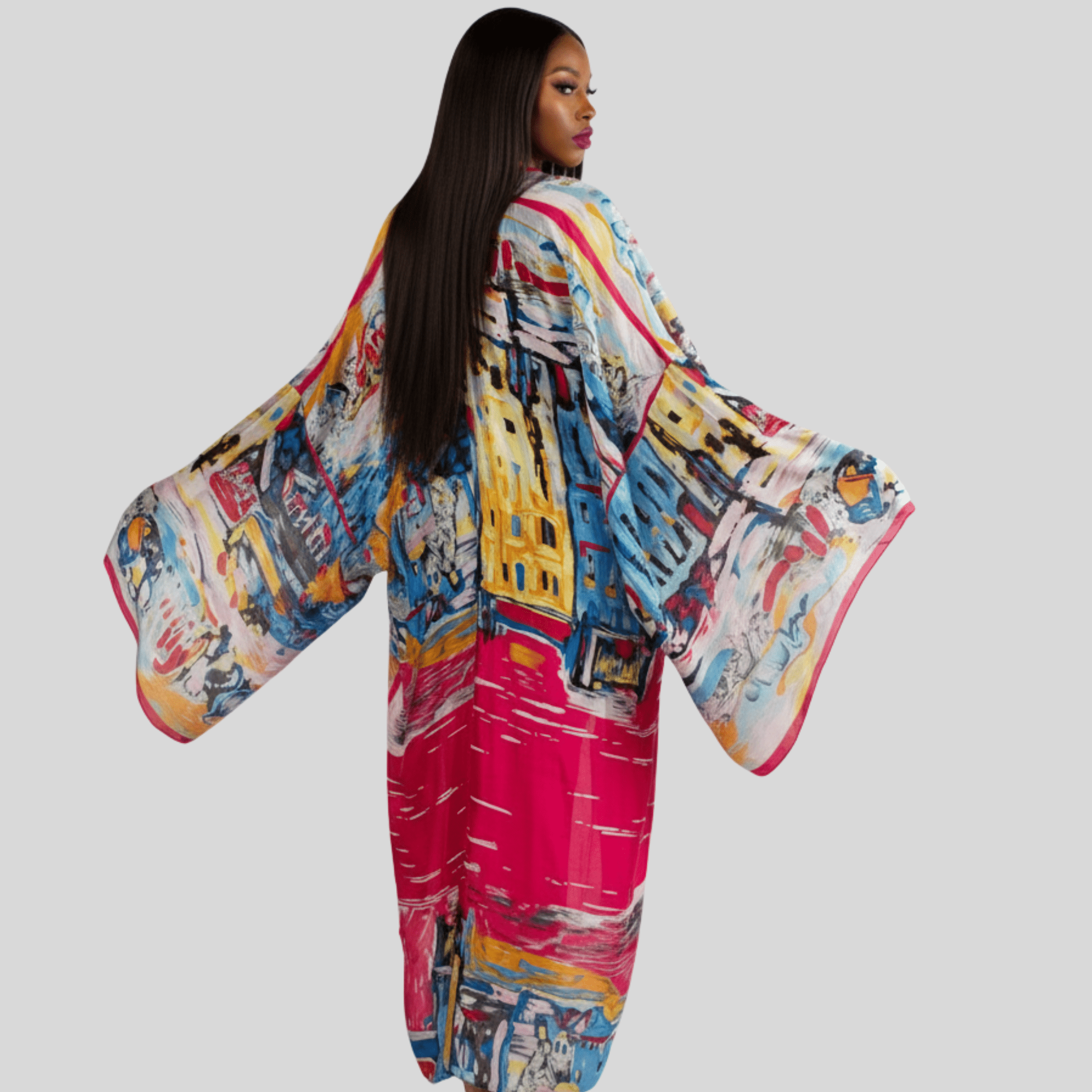 The Cannes Kimono is that bold, breezy layer that feels like a sunset stroll along the French Riviera—fluid, colorful, and unforgettable. Throw it on and suddenly a simple black dress or swimsuit looks like a whole moment.