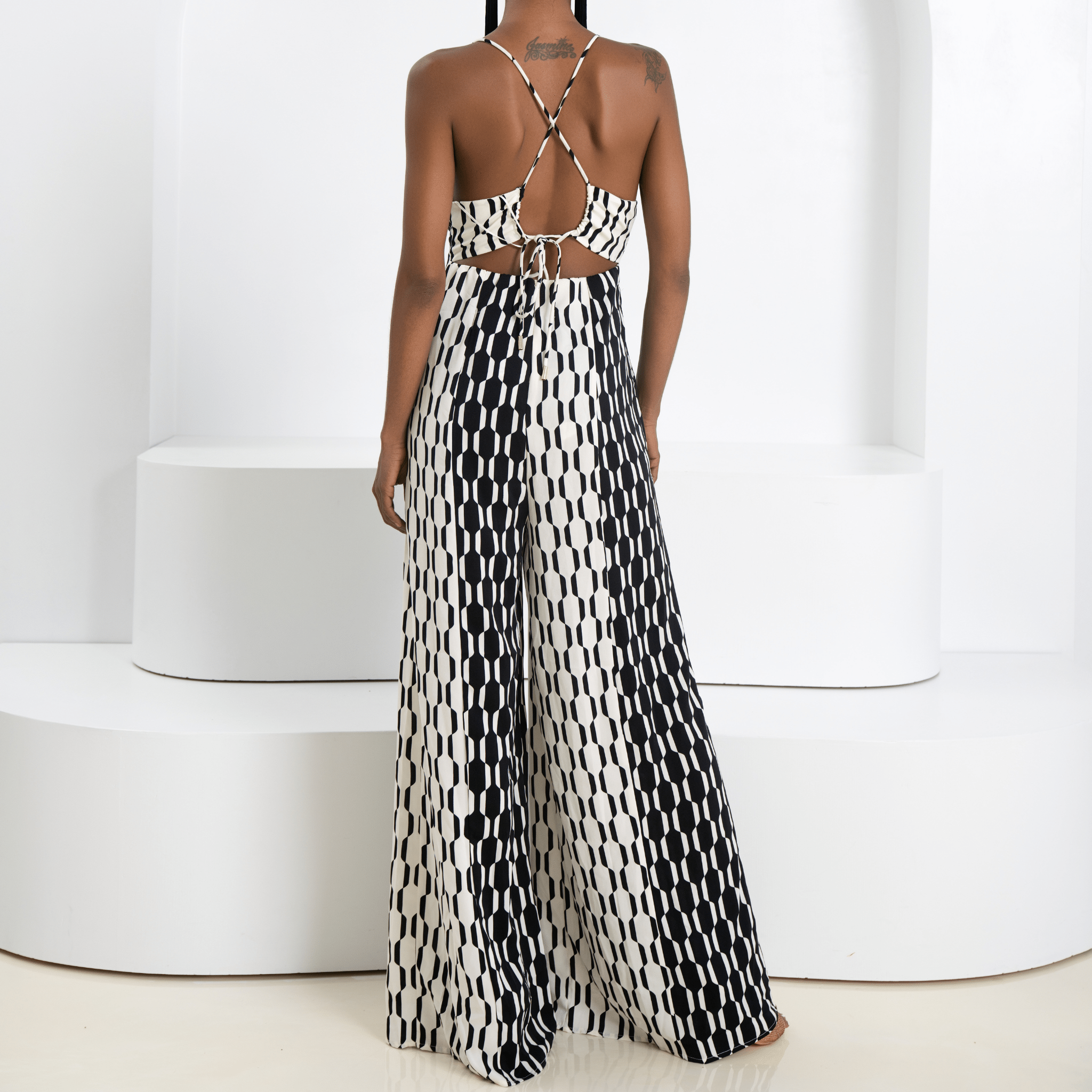 Step into the spotlight with The Checkmate Jumpsuit — a graphic black-and-white statement piece designed for the woman who moves through life like it’s her runway. Featuring a geometric print that elongates the frame and chain-detail straps that add a touch of gold-toned glamour, this jumpsuit blends sophisticated tailoring with resort-ready ease.