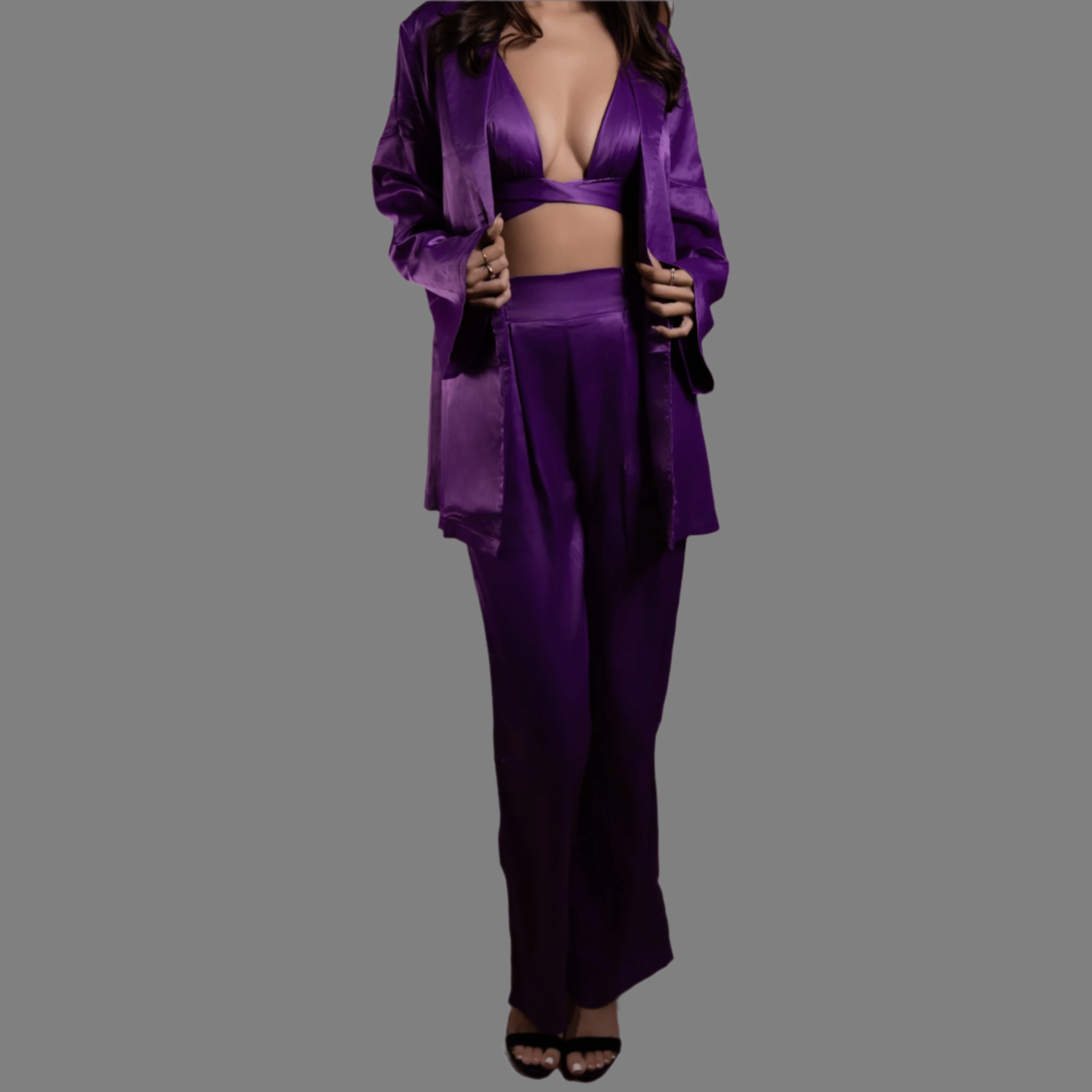 This dazzling three-piece satin ensemble from La Luz Boutique radiates confidence and luxury. The pants feature comfortable stretch and an elastic back waistband for a perfect fit.
