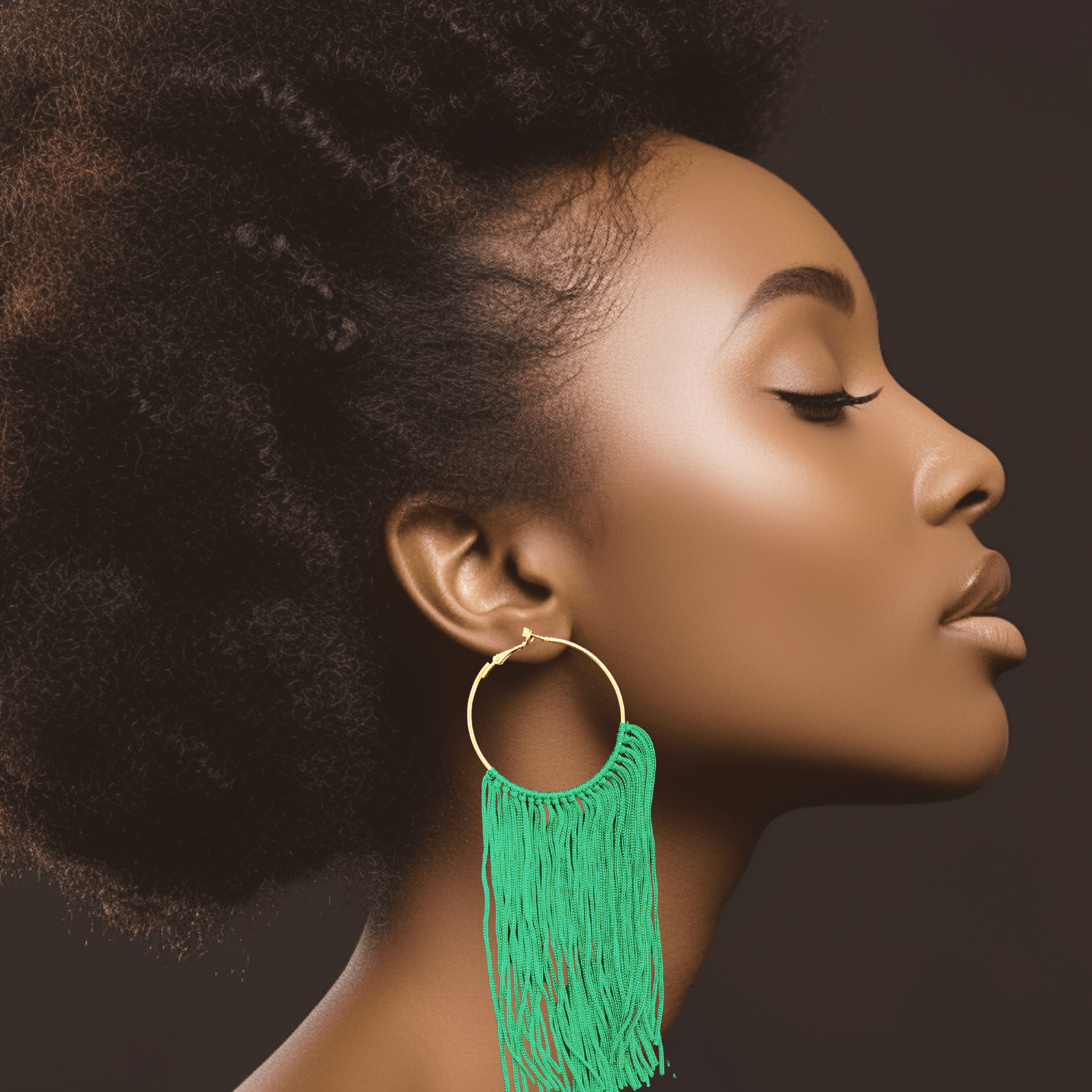 The Envy Fringe Hoop Earrings are a bold and beautiful statement piece designed to add instant flair to any outfit. Featuring a gold-tone hoop with striking green fringe, these earrings offer a dynamic look that sways with your every move.