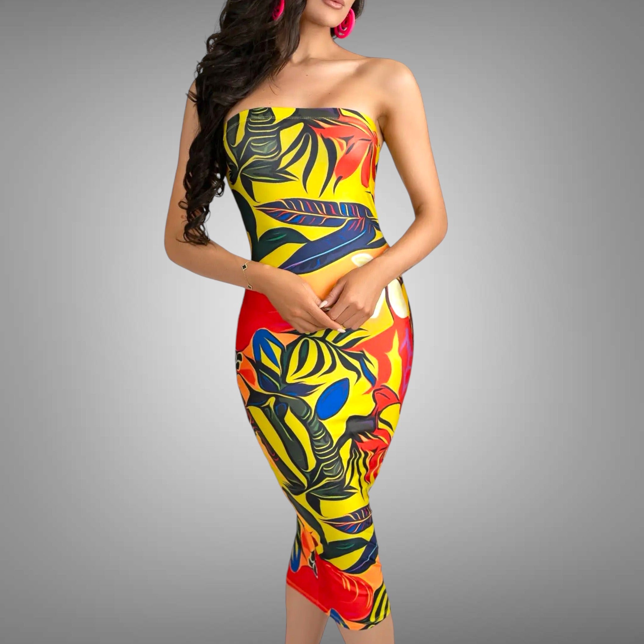 This Flora Bodycon Dress is the perfect choice for any summer party or vacation! It features a beautiful and vibrant tropical print that will make you stand out in the crowd.