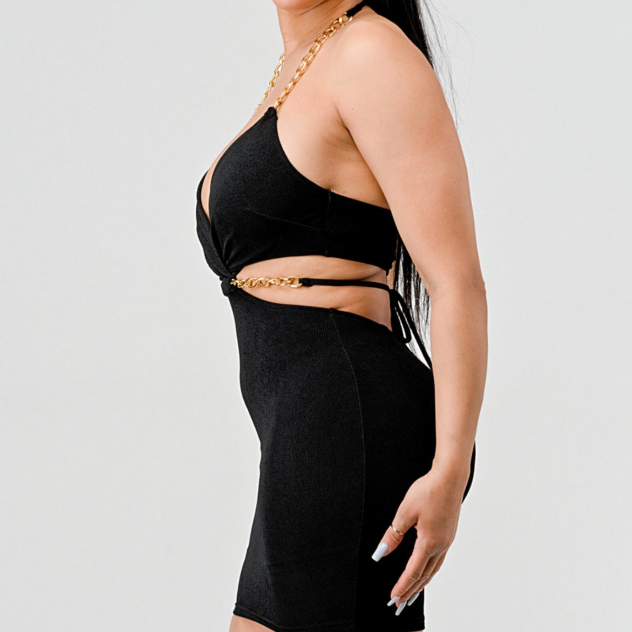Command attention with the Golden Nights Halter Mini Dress. This sleek black number features a deep V-neckline, adorned with opulent gold chain straps. Cut-outs accentuate your waist, while the figure-hugging silhouette promises head-turning allure. Perfect for cocktail parties, nightclubs, or any occasion where you want to exude confidence and elegance.