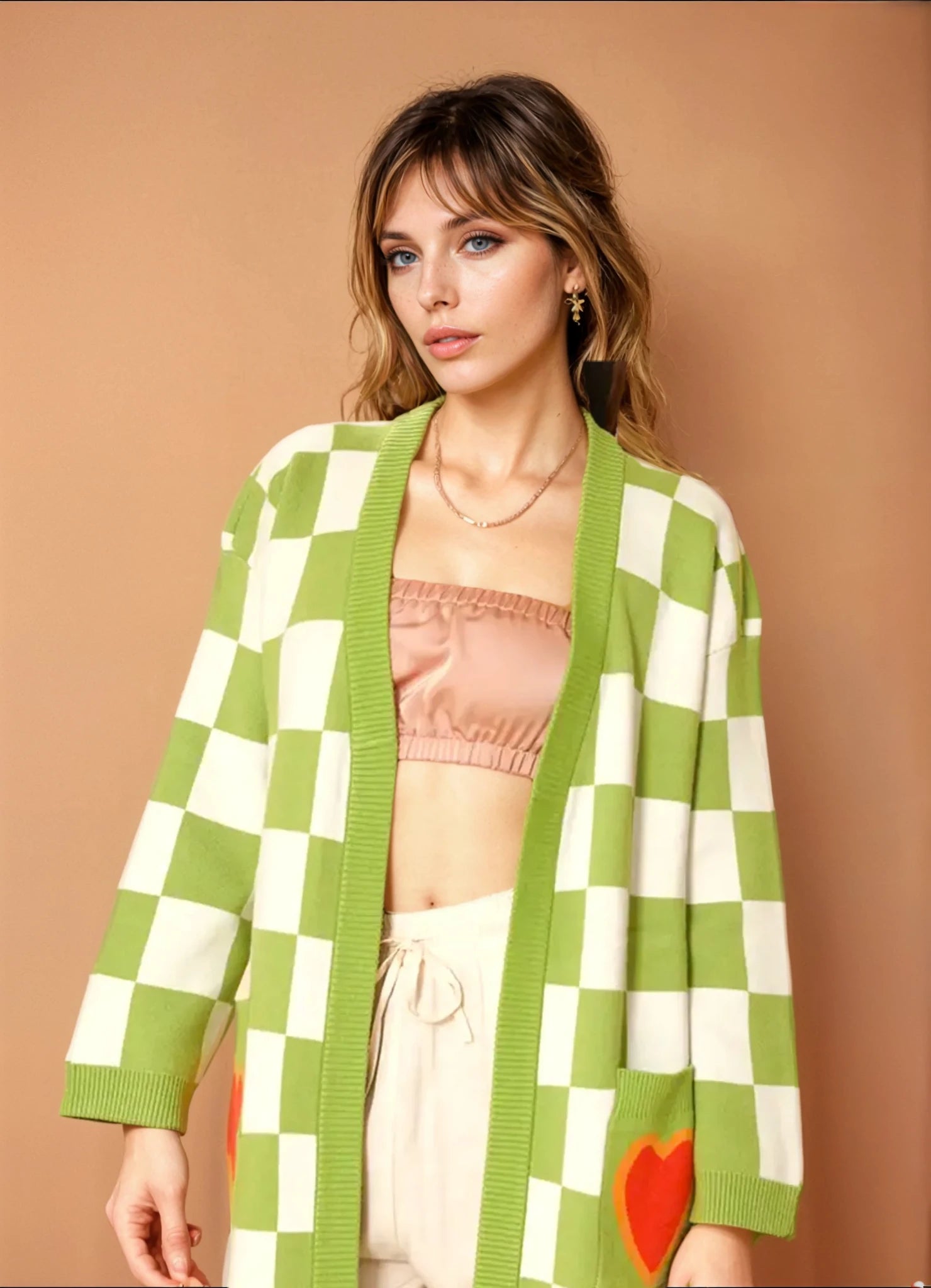 -Checkered heart cardigan -Heart patch pockets