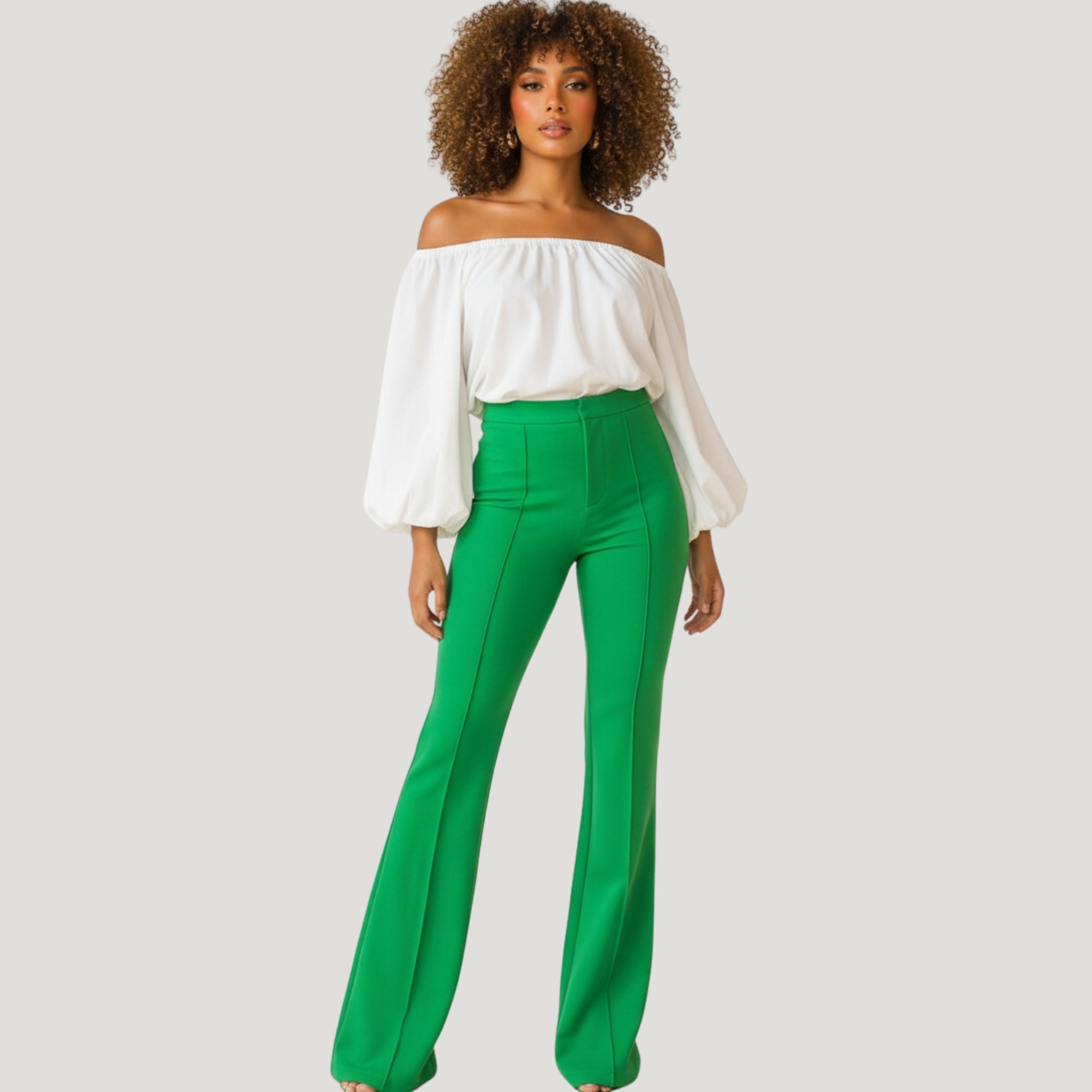 Turn heads with the striking silhouette of the Lannah High Rise Flare Pants. These statement pants feature a high-waisted design and a trendy flare cut, perfect for elongating the legs and adding an effortlessly chic vibe to your wardrobe. The center seam adds a touch of tailored sophistication, while the faux back pockets give a sleek and polished look without compromising comfort.