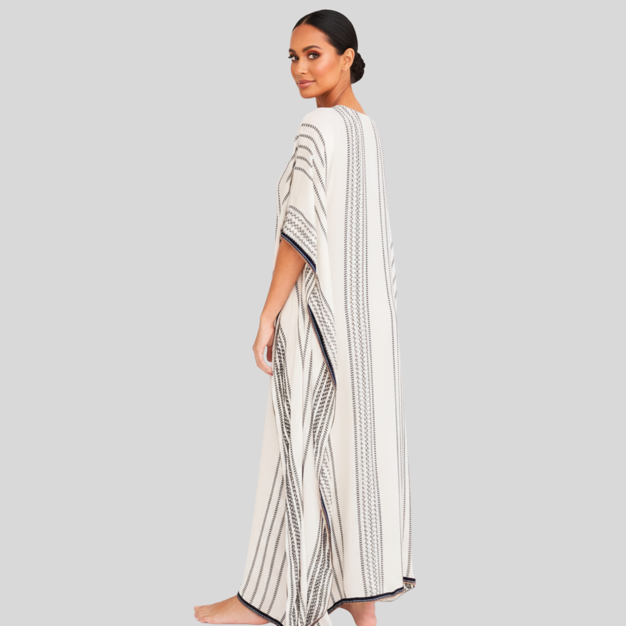 The Jaipur Whisper Kaftan is your new favorite everything piece—crafted from airy, hand-loomed fabric sourced directly from India. This free-flowing maxi features a bold Inca-inspired trim along a flattering deep V-neckline, while the wide flutter sleeves and full-length drape create a silhouette that moves like poetry.
