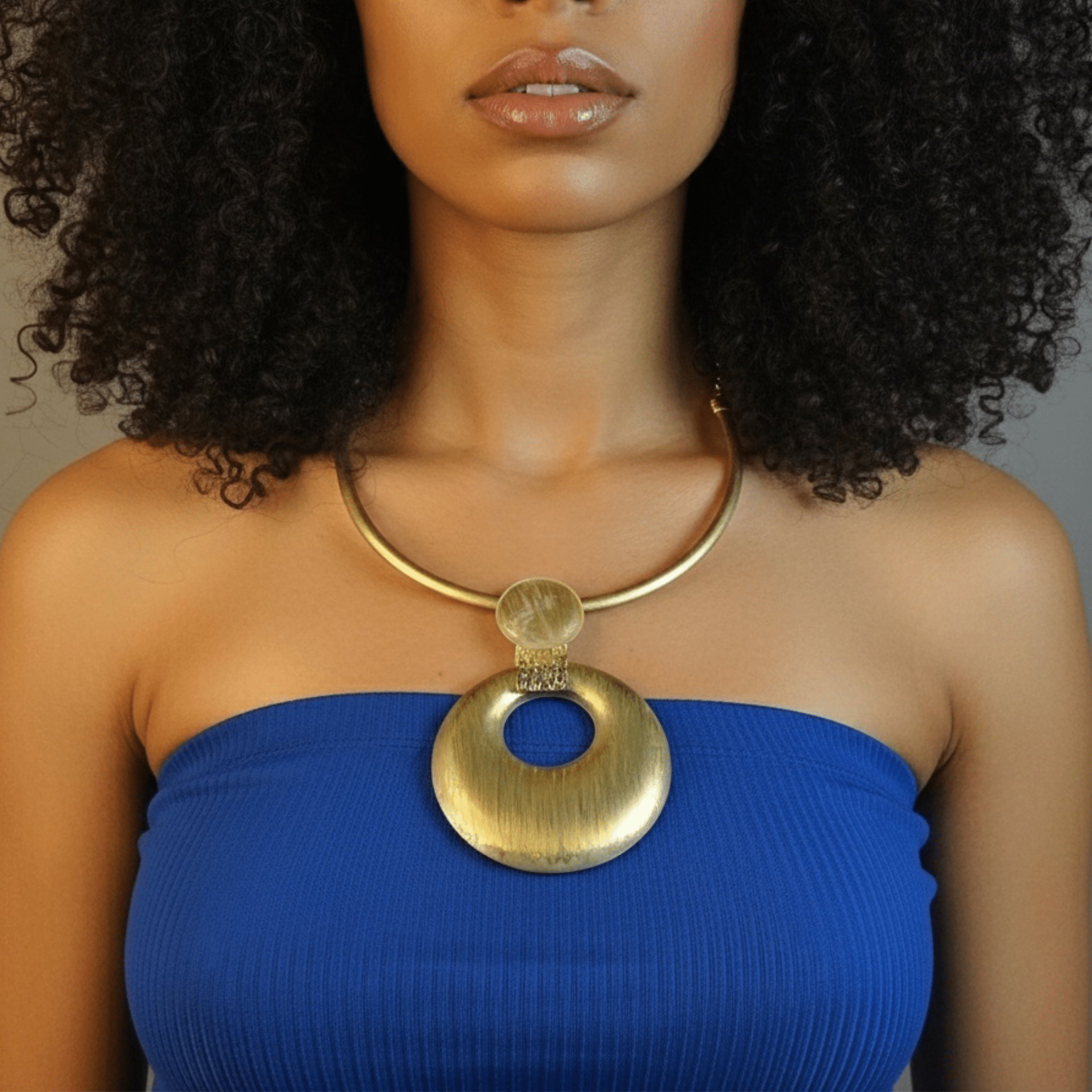 Featuring a large circular brushed gold enamel pendant accented with polished metallic detailing, this piece radiates contemporary glamour while nodding to timeless runway style.