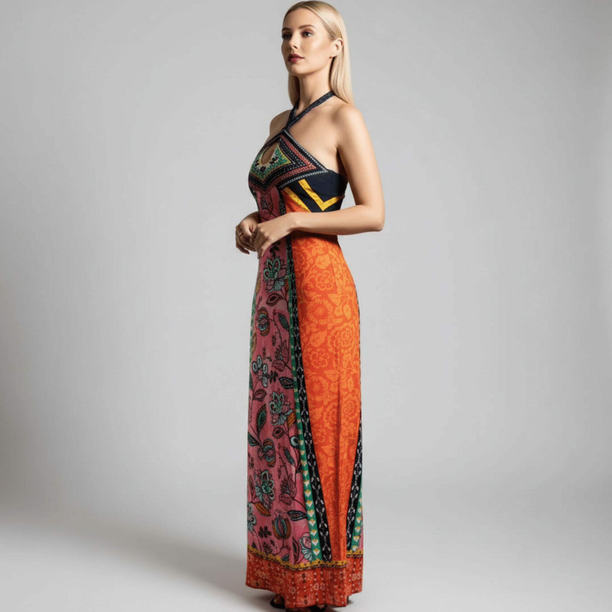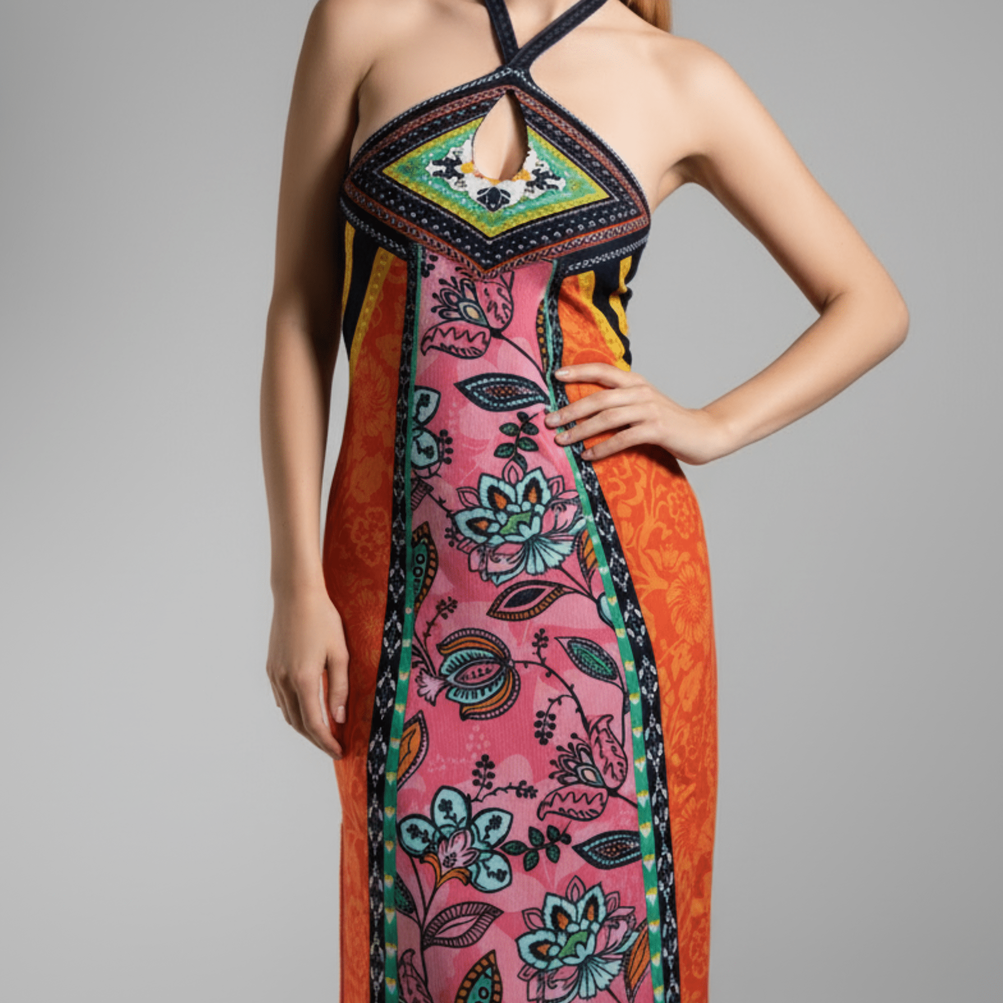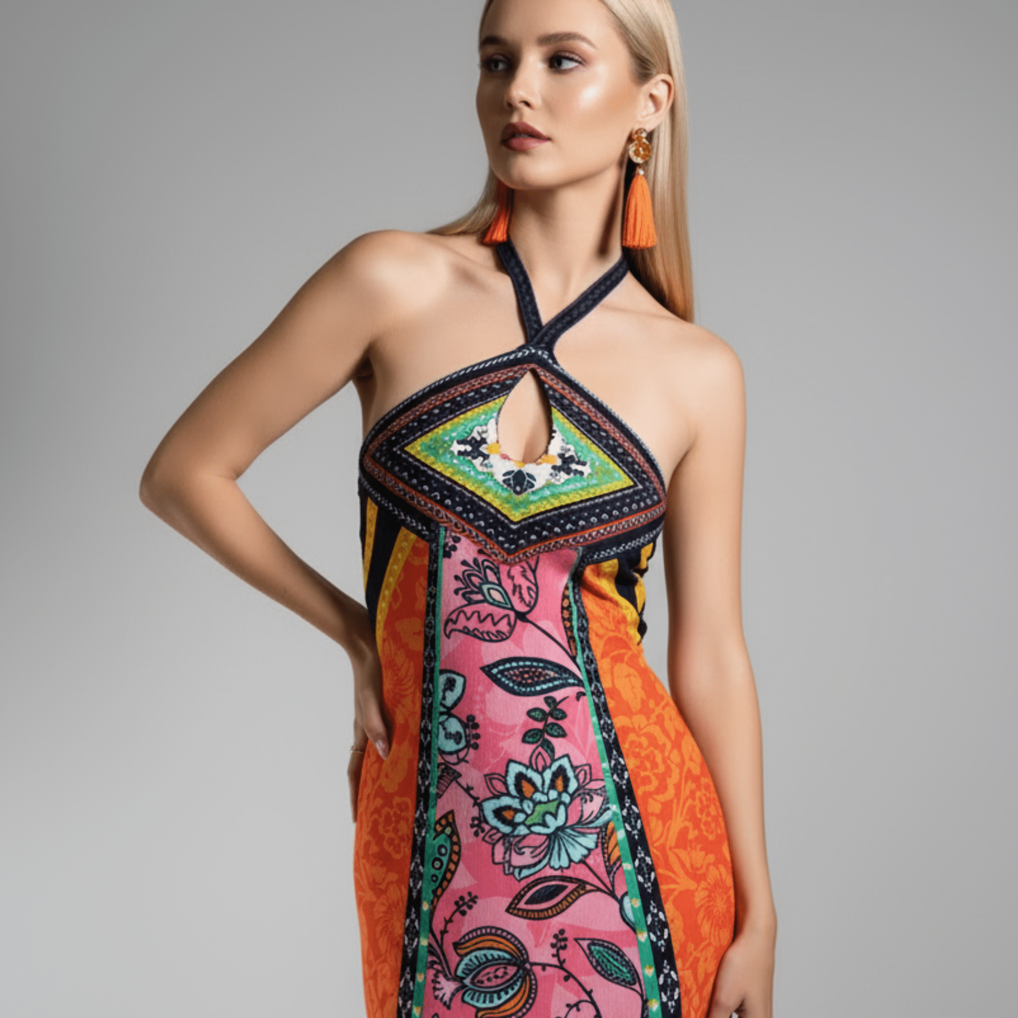 Style tip: Pair it with orange or turquoise statement earrings to complement the dress’s bright hues, or opt for gold hoops for a classic, elevated look.