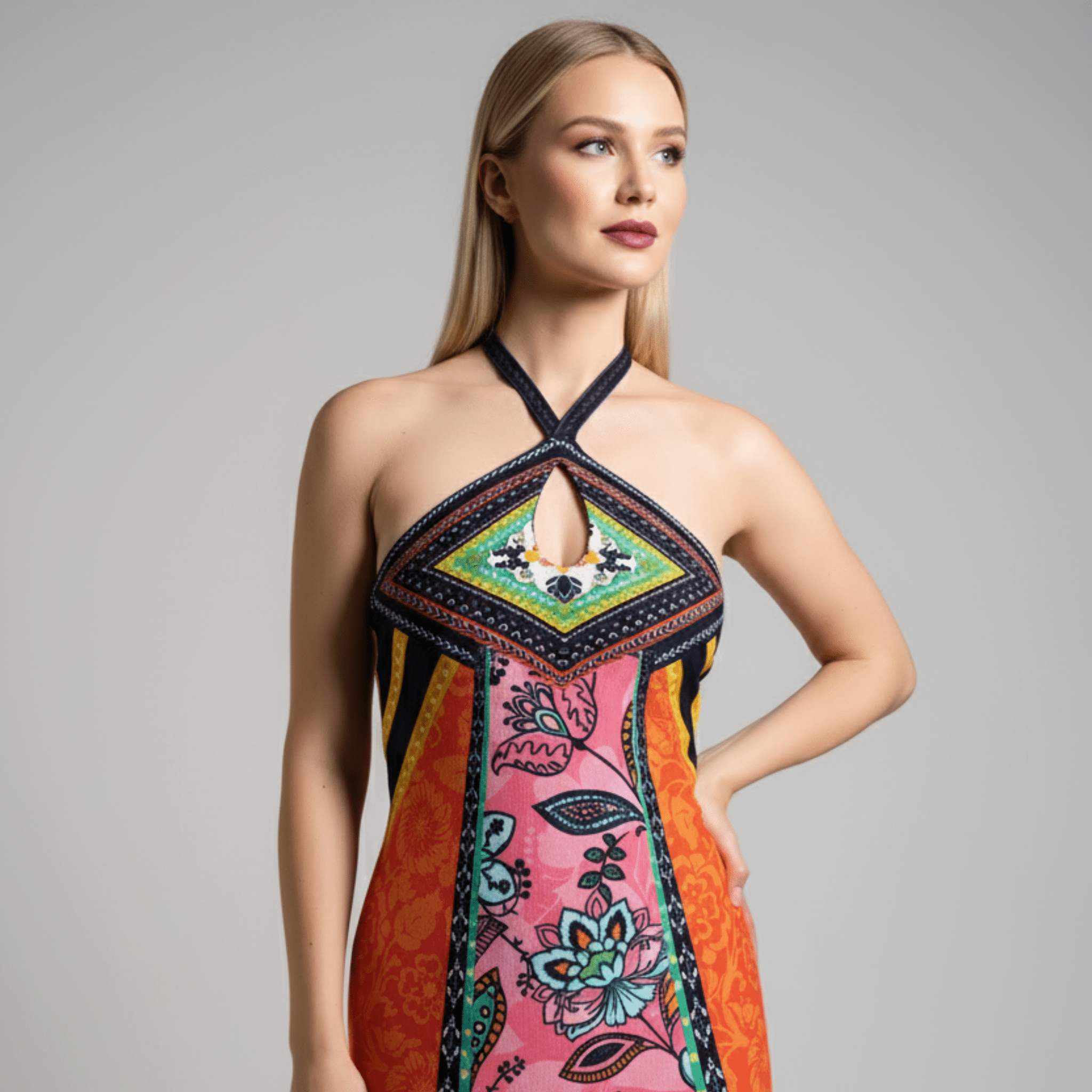 The La Isla Bonita Maxi Dress is your go-to for tropical elegance. With bold floral patterns and a chic halter neckline featuring a keyhole cutout, this vibrant maxi is perfect for sun-soaked getaways.