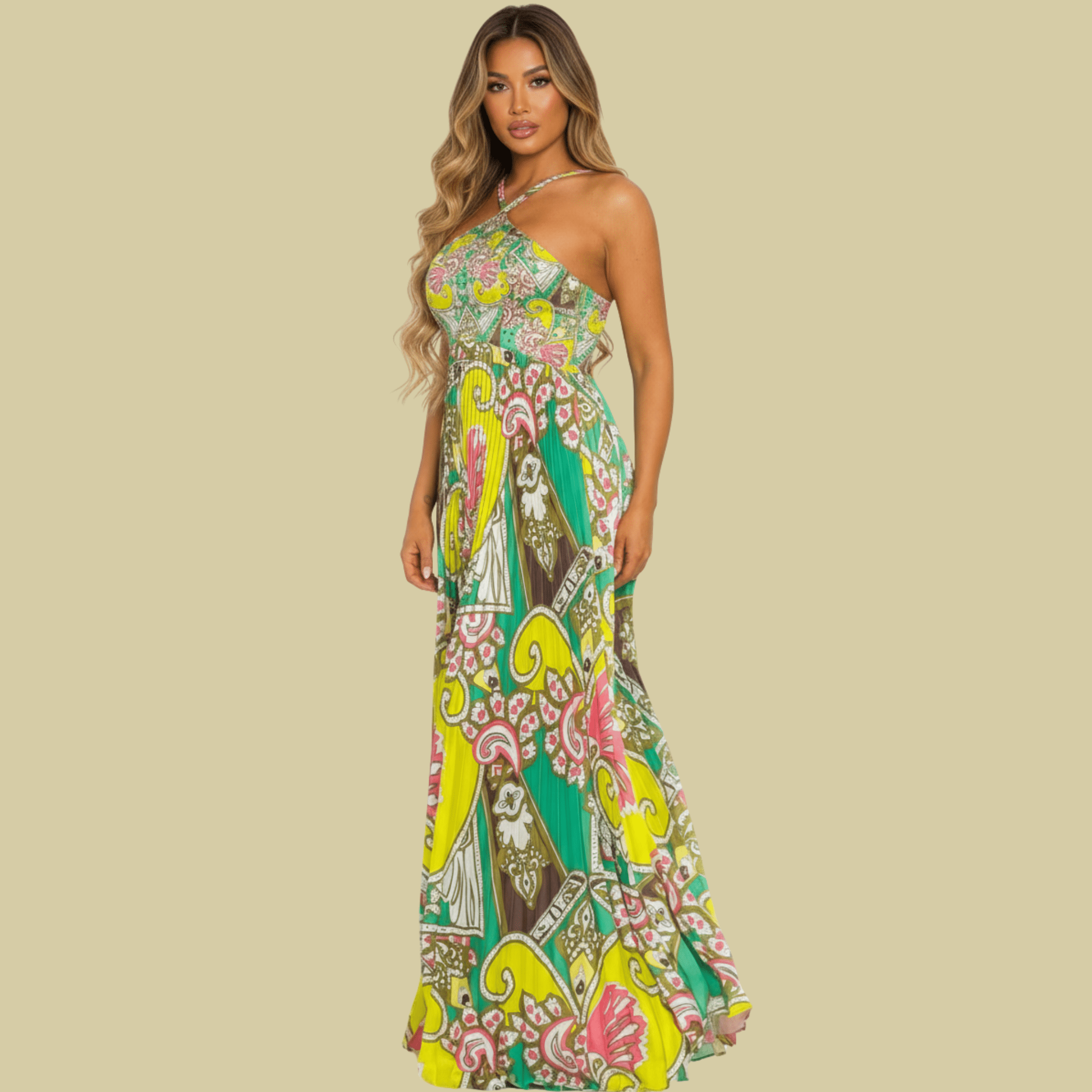 elevate your wardrobe with the La Reina Maxi Dress, a statement piece designed for elegance and sophistication. Featuring a vibrant, intricate print and a flowing pleated silhouette, this dress is perfect for special occasions, tropical getaways, and upscale events. The asymmetrical halter neckline with a sleek strap detail adds a unique touch, while the fitted bodice enhances the waistline for a flattering fit. The lightweight, breathable fabric ensures comfort, making it ideal for warm-weather occasions.