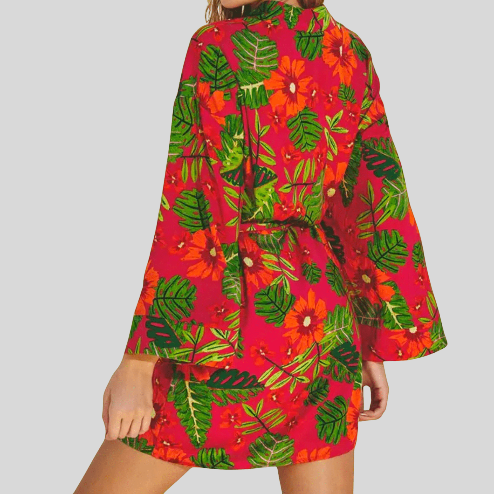 - Island Vibes: Drenched in bold tropical florals and hues of fiery orange, lush green, and radiant red, this kimono exudes warmth and charm.