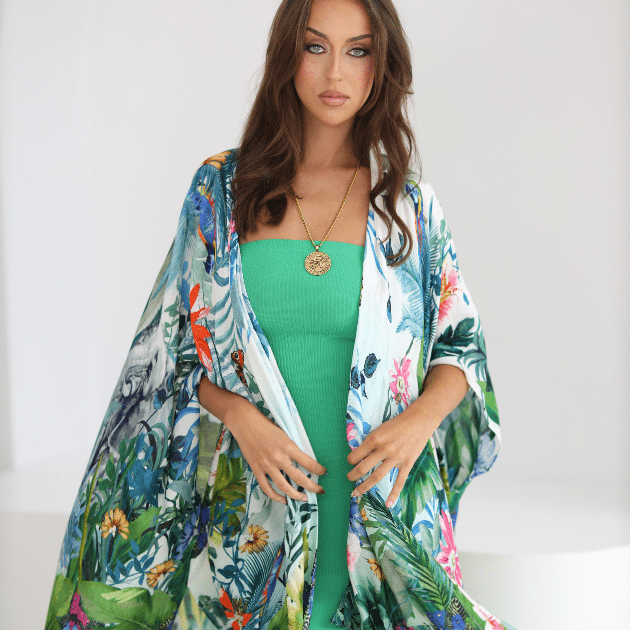 Shown here paired with our curve-hugging Tatiana Mini Dress in Green, this kimono elevates every look—from beachside mornings to rooftop evenings. The open front, generous drape, and wide sleeves make it as wearable as it is unforgettable.