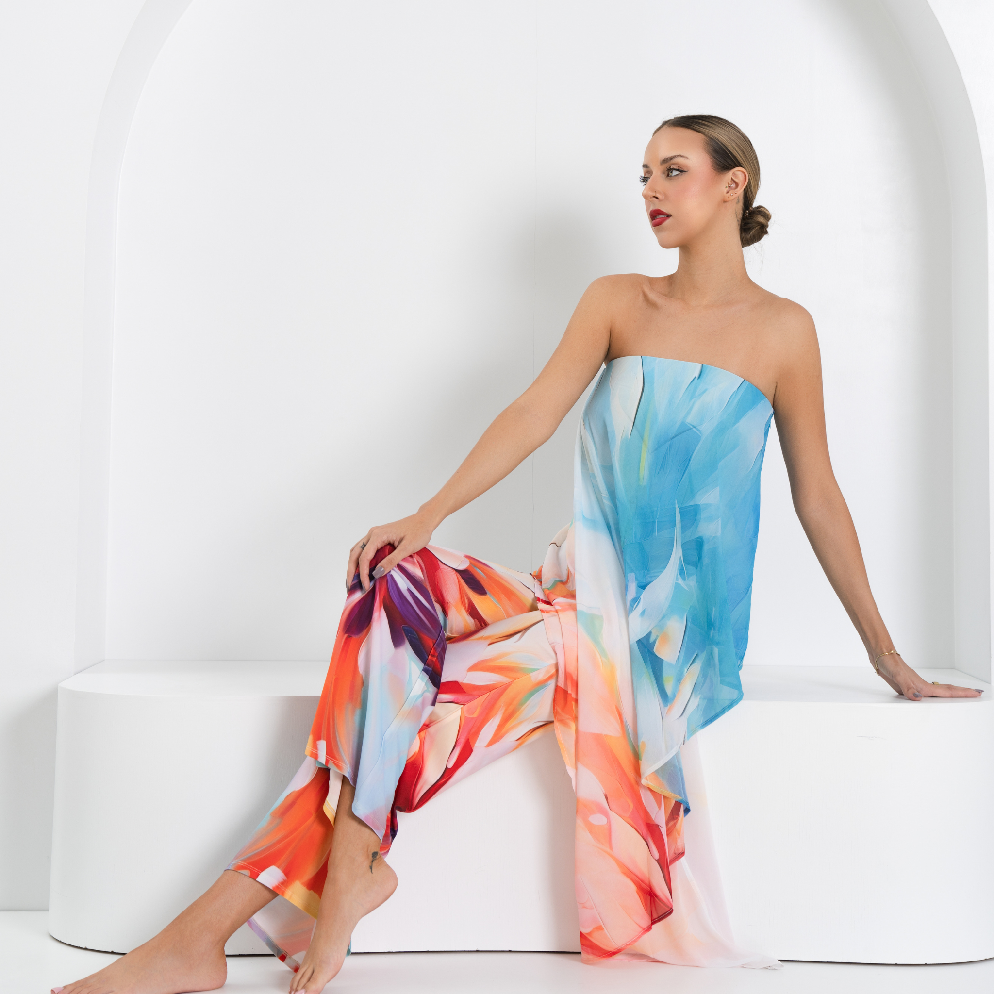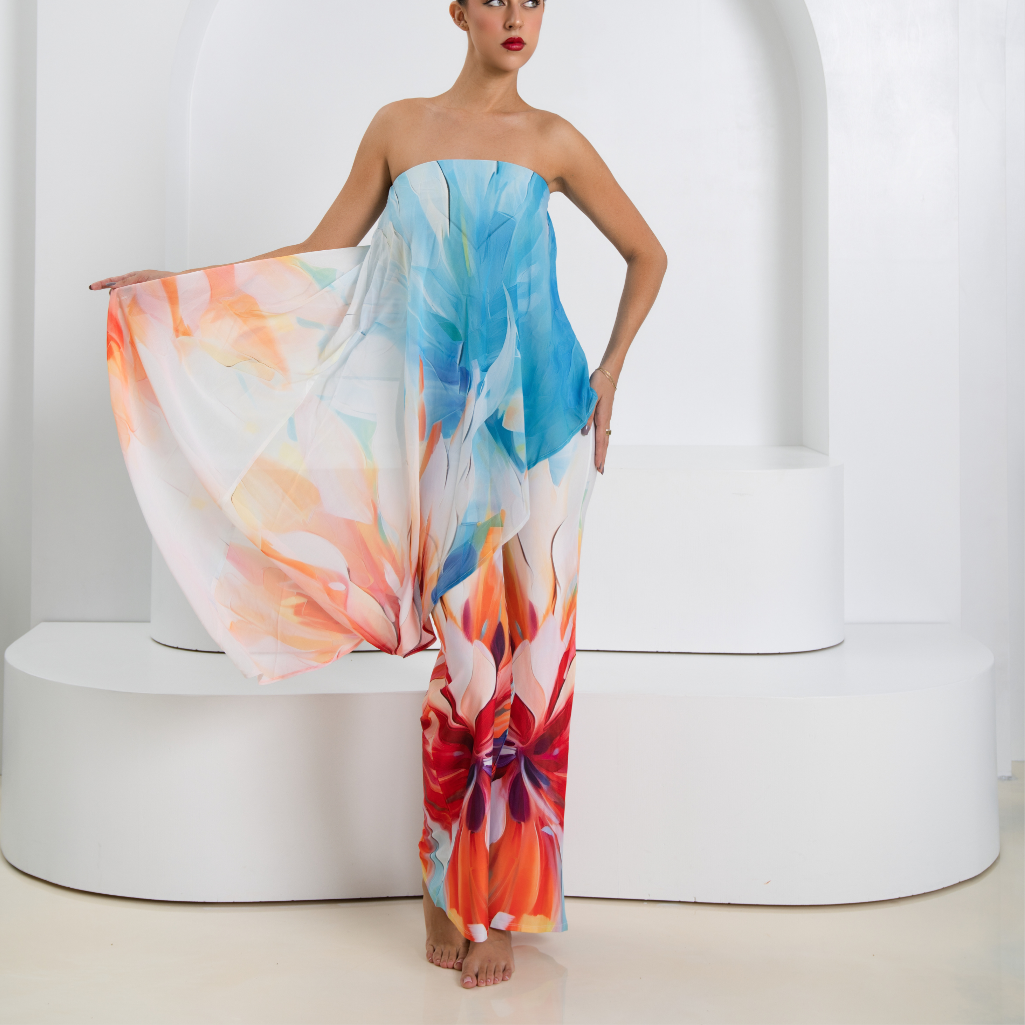 The Sunset Sonata Jumpsuit captures the art of movement and color in one effortless piece. Featuring a strapless silhouette and flowing wide-leg design, this lightweight chiffon jumpsuit drapes like a painted sunset — blending vibrant coral, blue, and amber hues that evoke tropical evenings and seaside escapes. Side zipper closure.