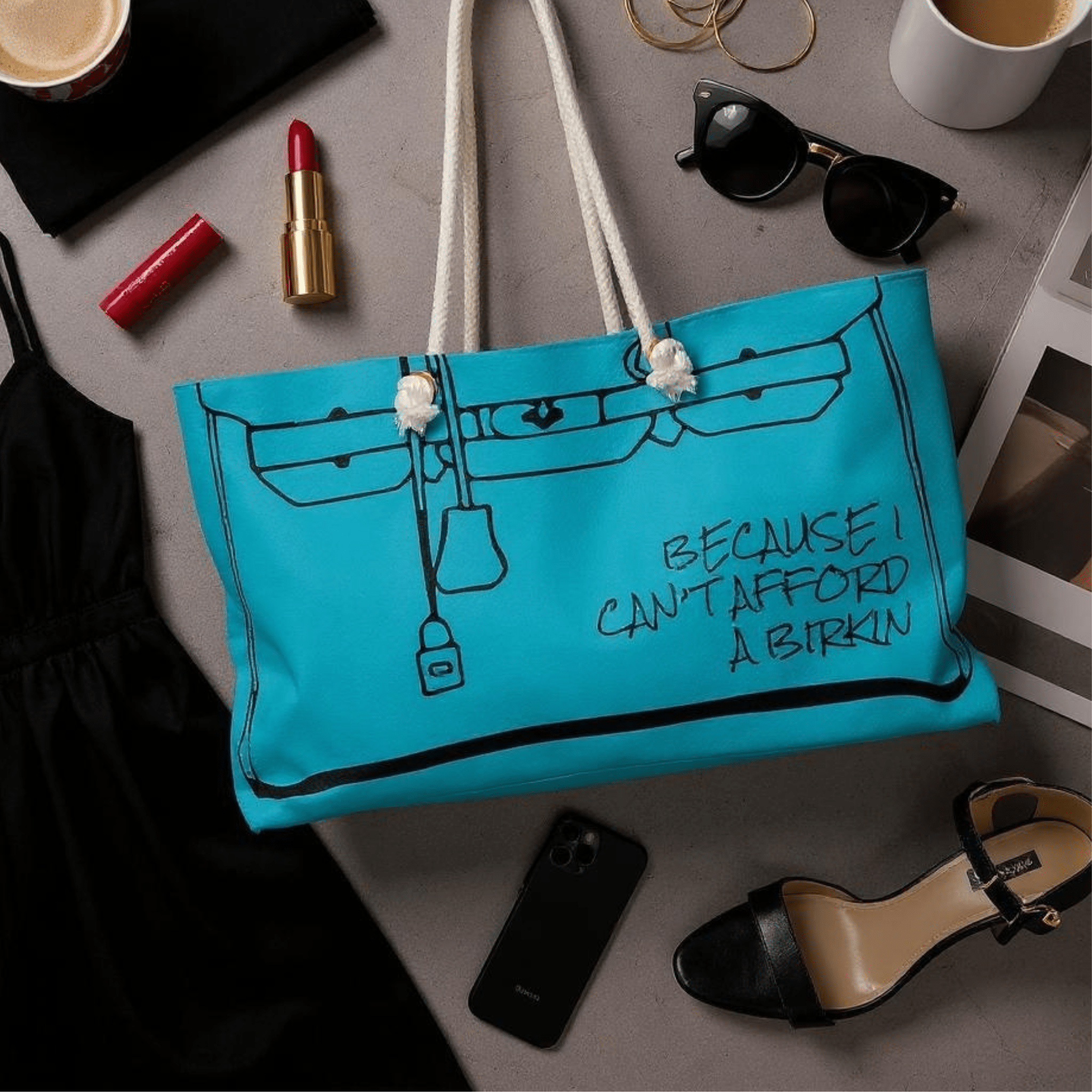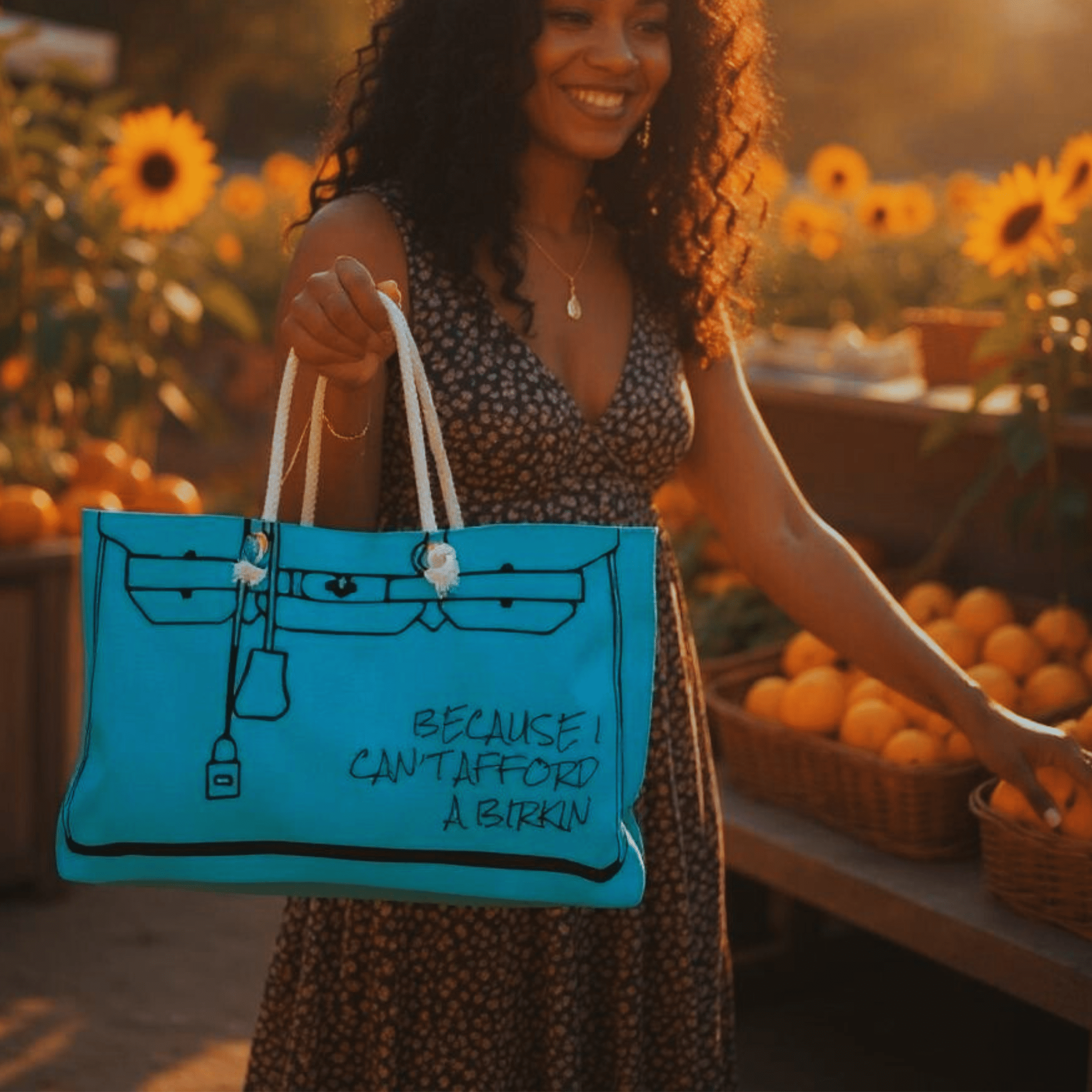 Make a bold statement with our Teal 'Can't Afford a Birkin' Weekend Tote — the ultimate blend of humor, function, and fashion. Crafted in vibrant turquoise with sturdy rope handles and a cheeky graphic nod to the iconic Birkin, this 24" x 13" oversized tote is your go-to for beach days, weekend getaways, and everyday slay.