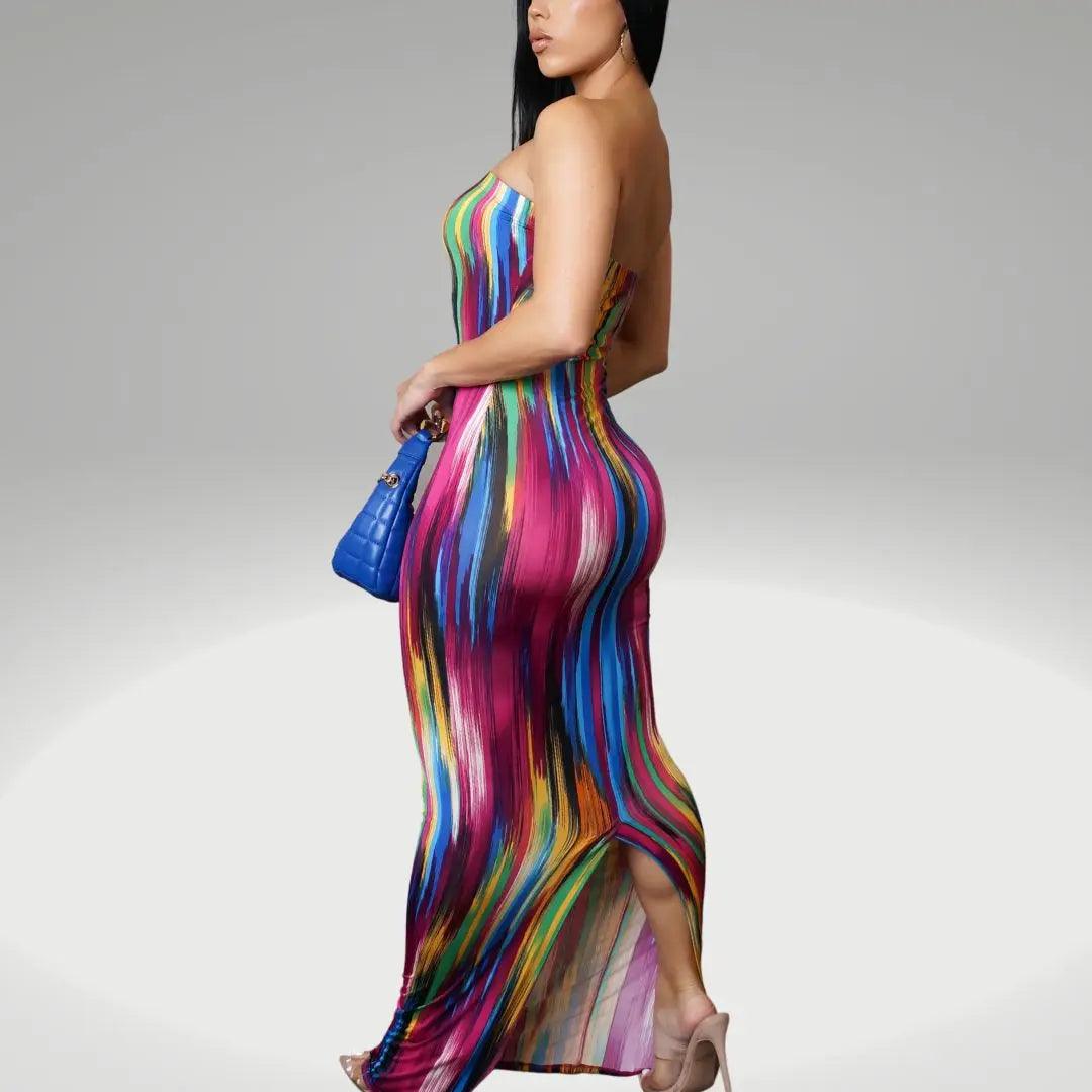 Upgrade your wardrobe with the Prism Maxi. Crafted with an abstract print in a luxurious blend of 95% polyester and 5% spandex, this maxi is sure to bring sophistication and exclusivity to any look. Express your unique style and feel the luxurious comfort of the Prism Maxi.