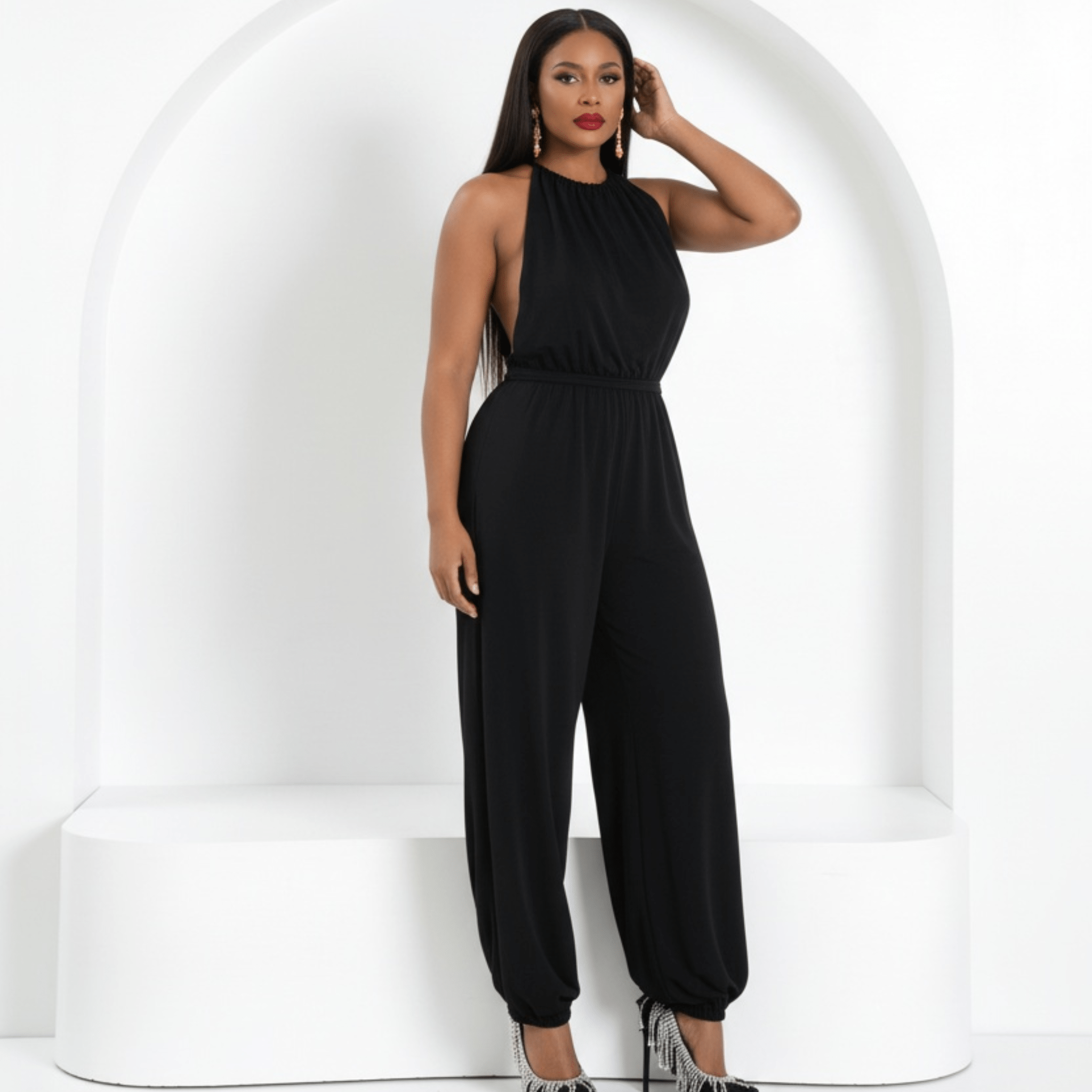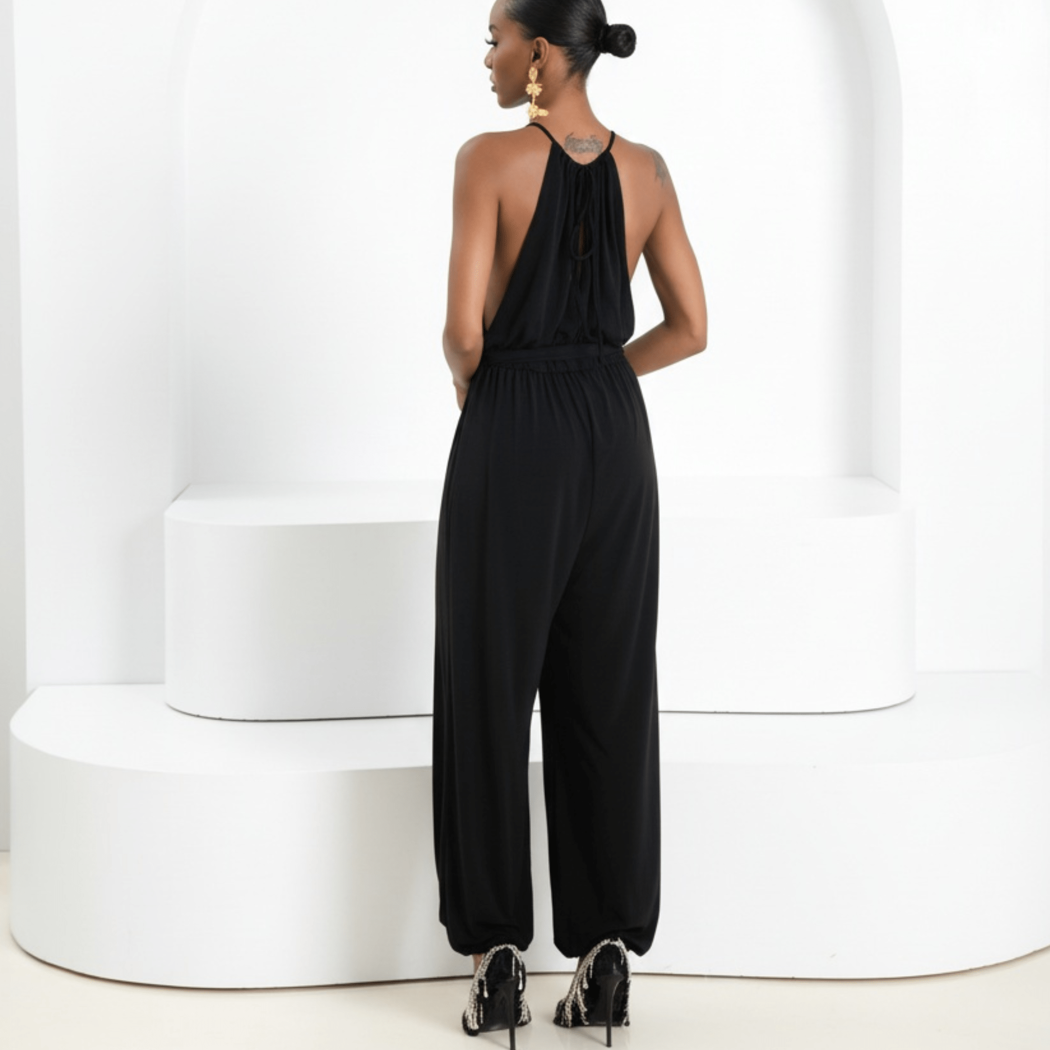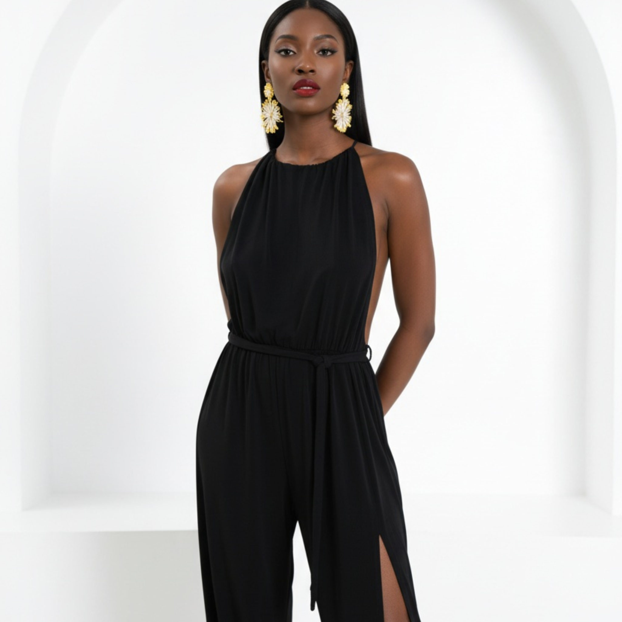 The halter neck design highlights the shoulders and adds a touch of grace, while the adjustable tie at the neck provides a customizable fit. The fitted waistline gracefully contours your figure, leading down to the flowing legs with daring side splits. These splits not only add a flirty glimpse of skin but also allow for effortless movement, perfect for those breezy beach walks or elegant evenings.
